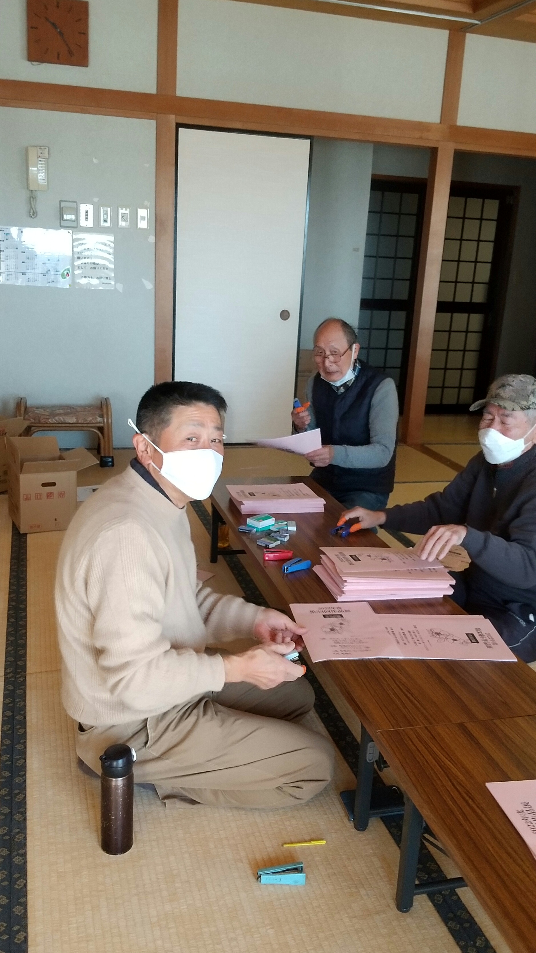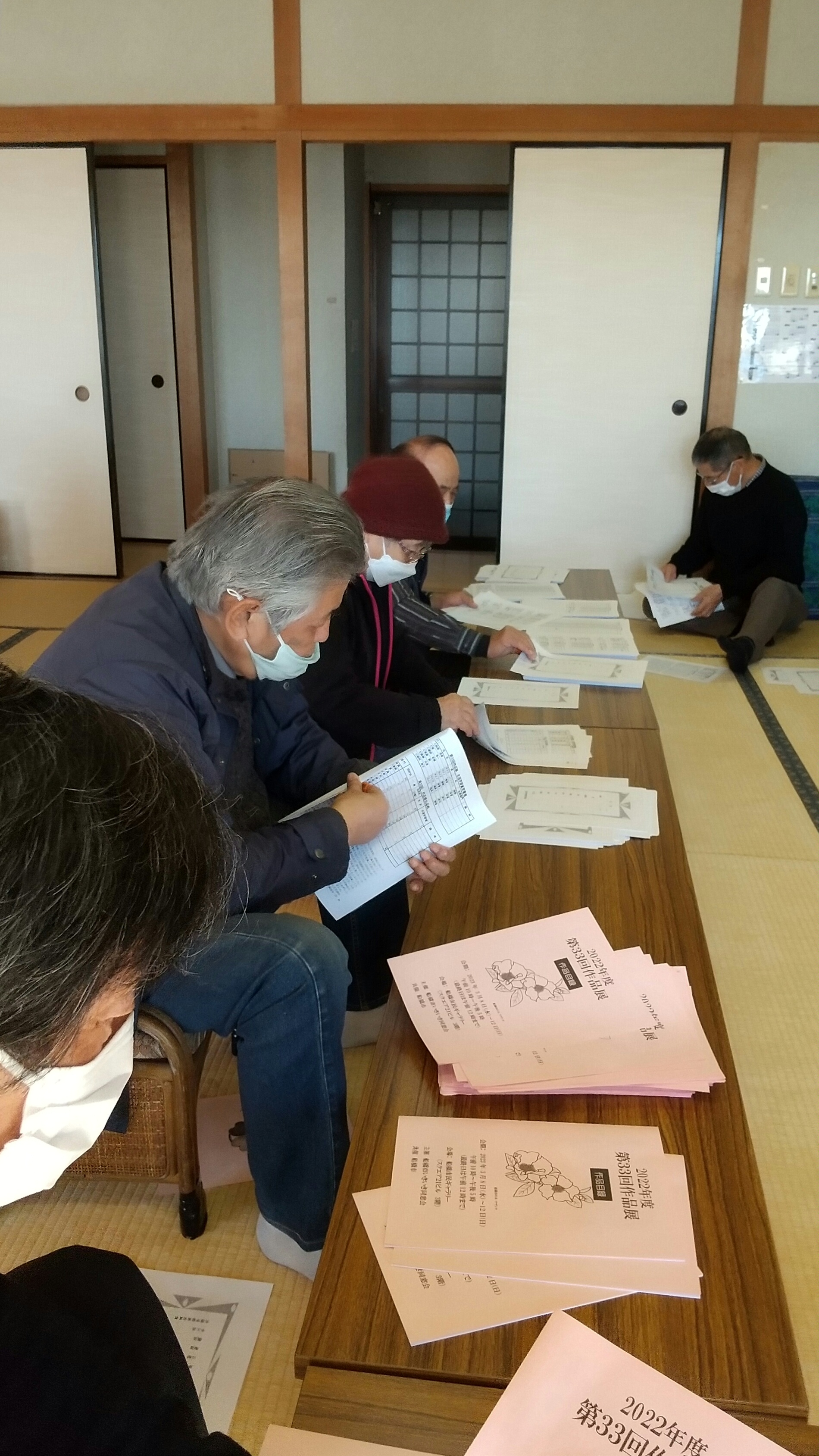 同好会推進部と文化教養部を中心に、各同好会からの出展申し込み、展示方法の説明等も終えました。写真は薬円台公民館で作品展のパンフレット作りをしているところです。実行委員会のメンバー13名が力を合わせて850部作製しました。