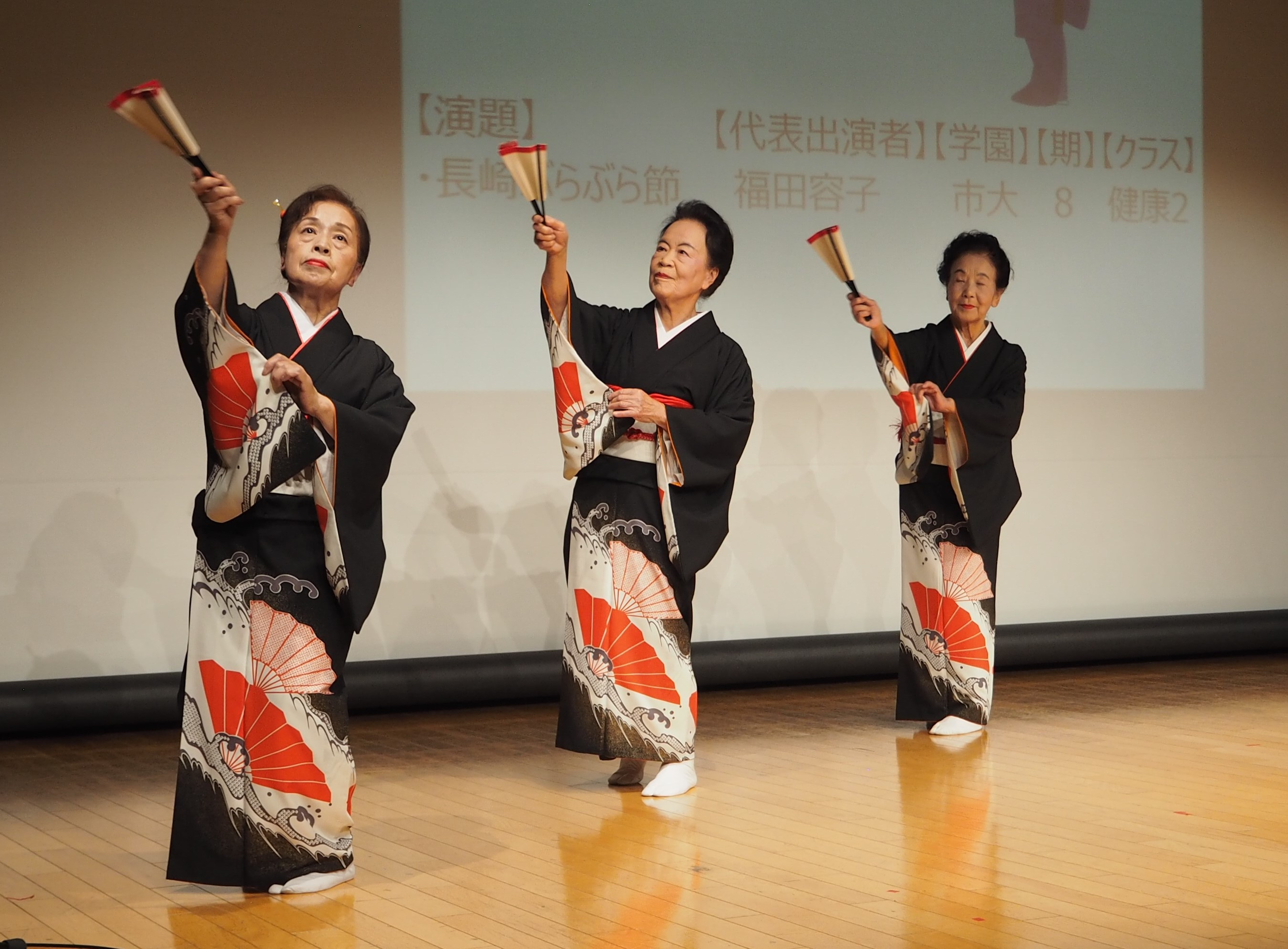 11月20日(月)船橋市きららホールで第33回いきいき同窓会芸能大会を開催しました。同ホールでの開催は今回初めて。プロジェクターを使って演目を紹介するなど演出も工夫。来場者・出演者併せて約240名が参加、同窓会会員の日頃の練習の成果を大いに楽しみました。