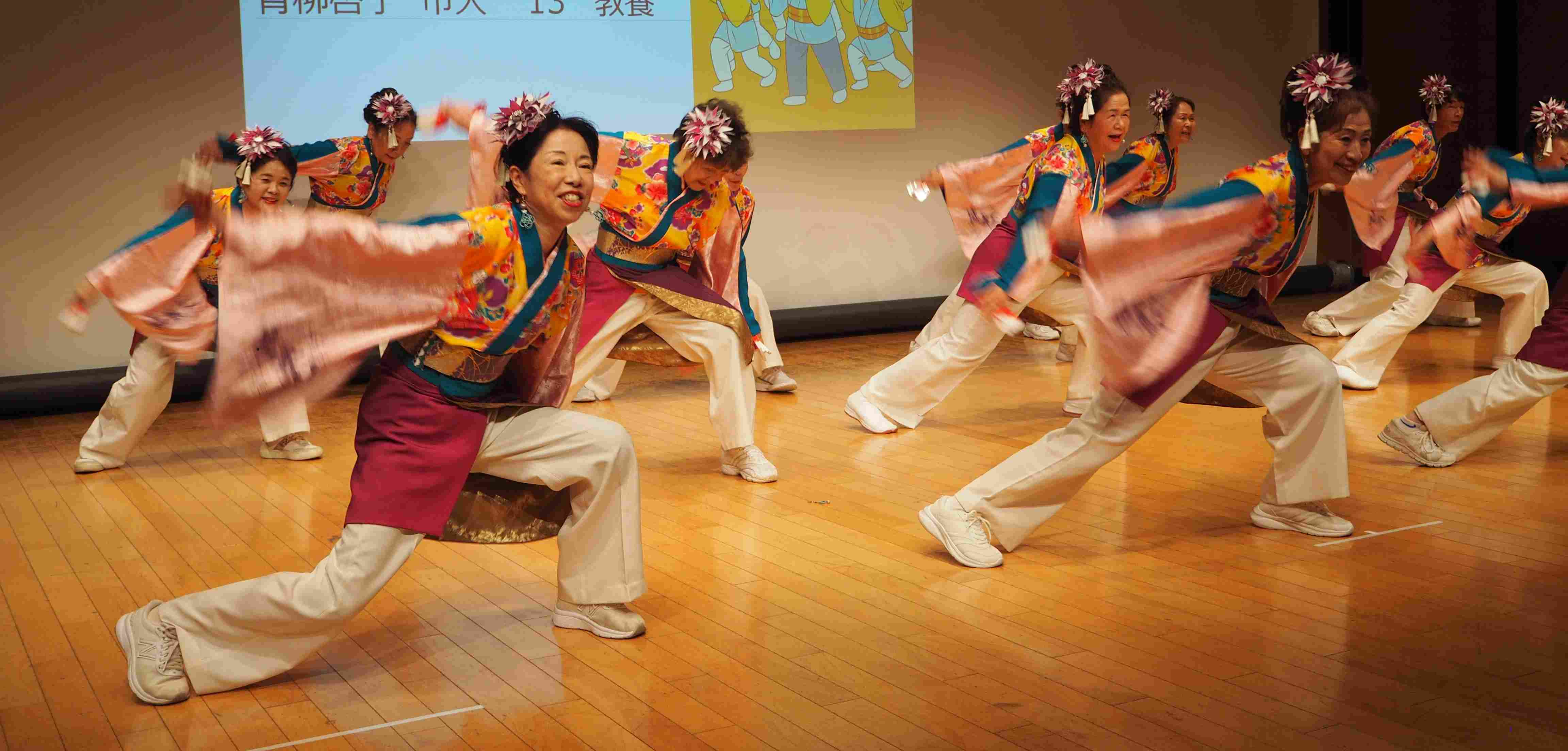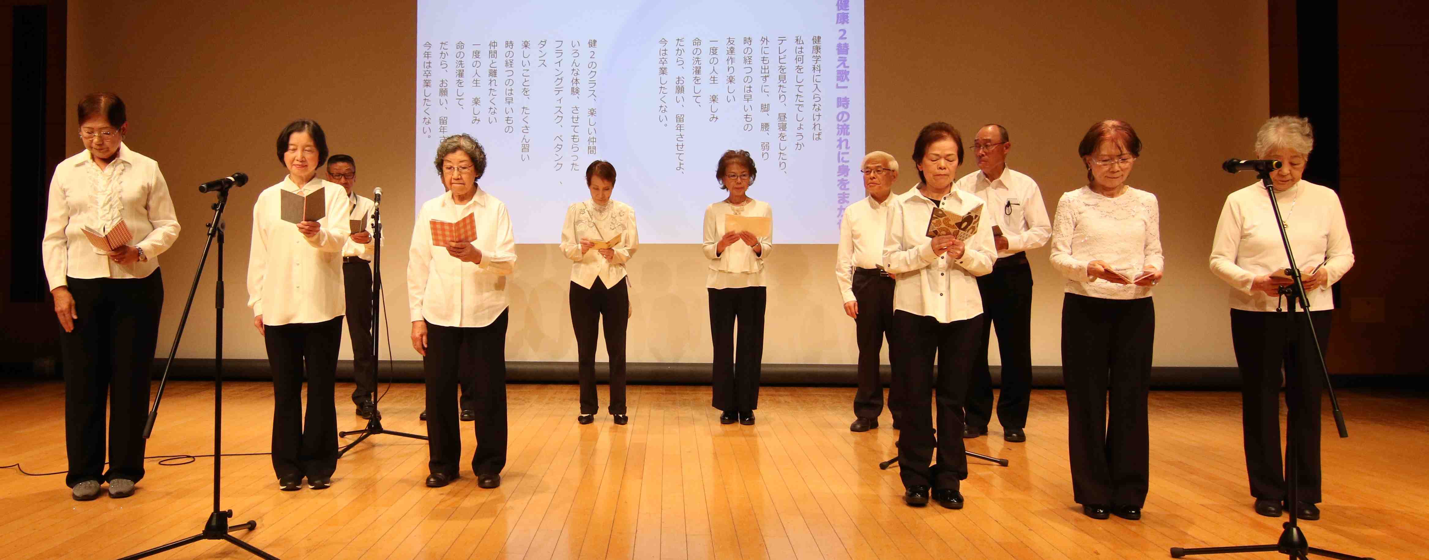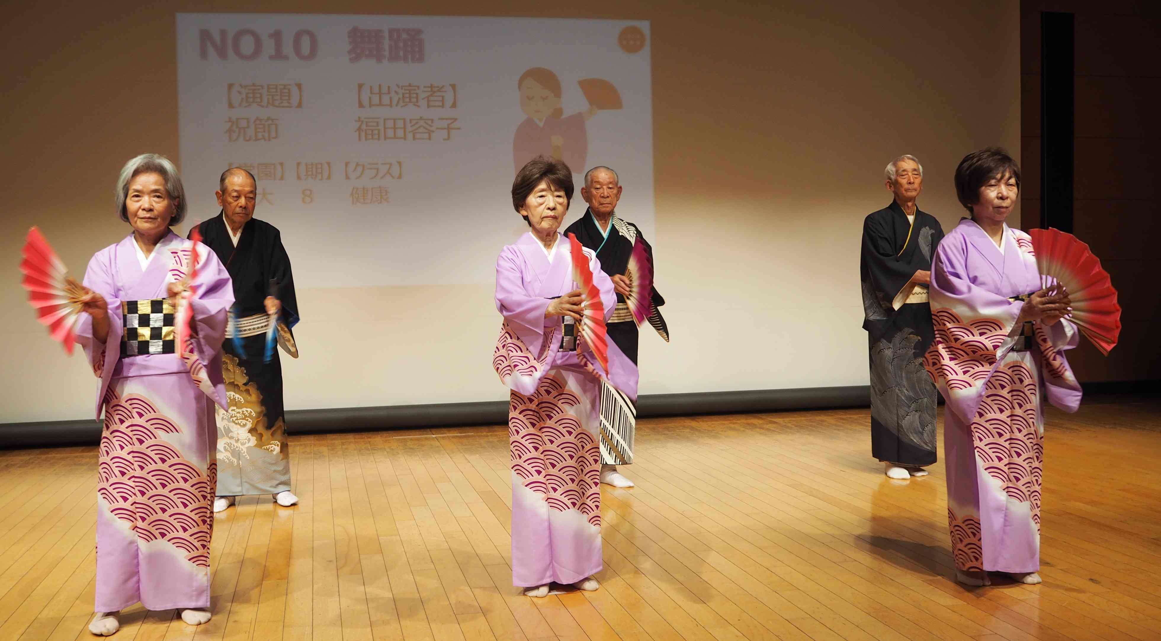 11月5日(水)きららホールで、第35回芸能大会を開催しました。総来場者数316名、内出演者数116名、観客(含実行委員)203名。詩吟・謡曲同好会の練習成果の発表、踊りや楽器演奏、太極拳、作曲、コーラスなど幅広いジャンルの演目が披露されました。13期のクラスが再結集し修了パーティーで披露した替え歌の発表、昨年度の市民大クラスの班長さんからなるフォークグループの演奏などもあり、いきいき同窓会ならではの大会となりました。