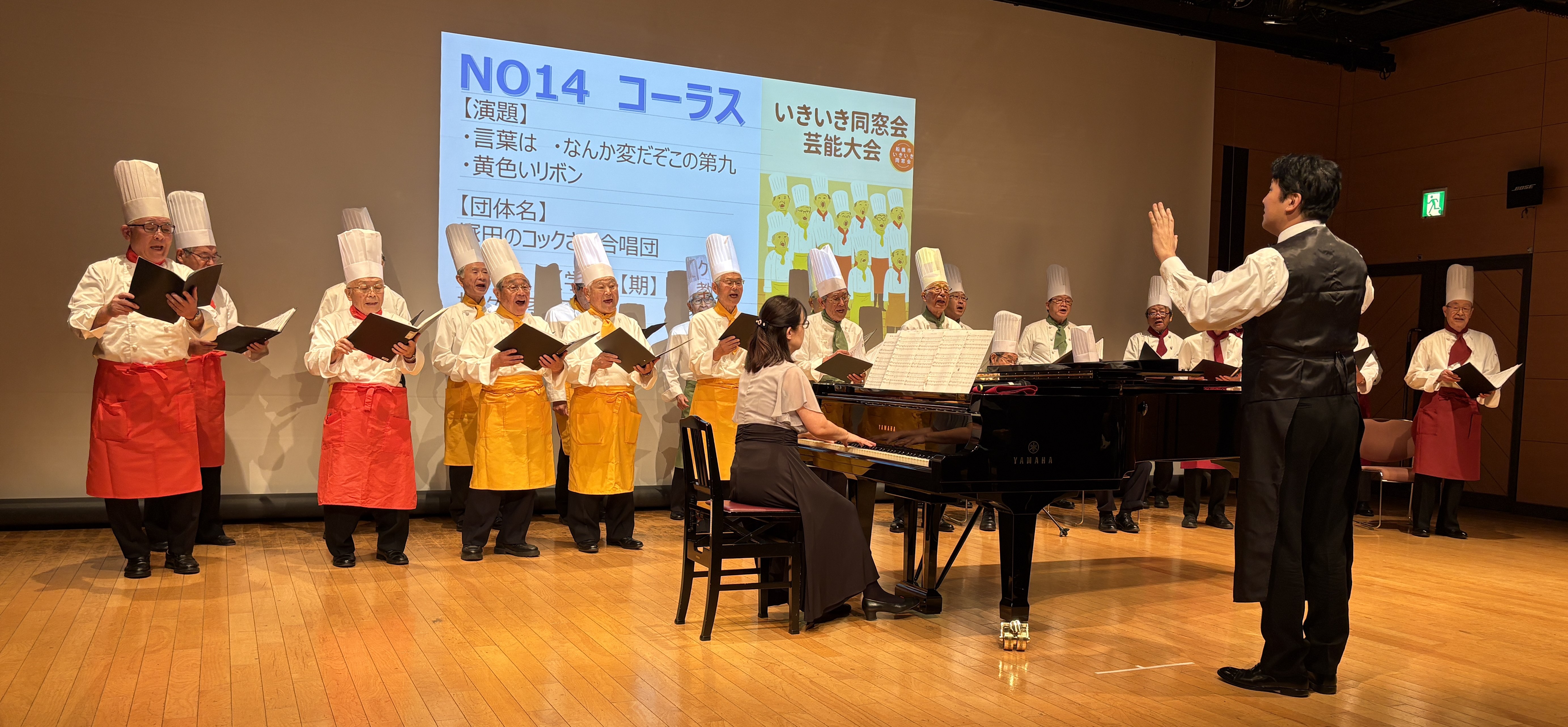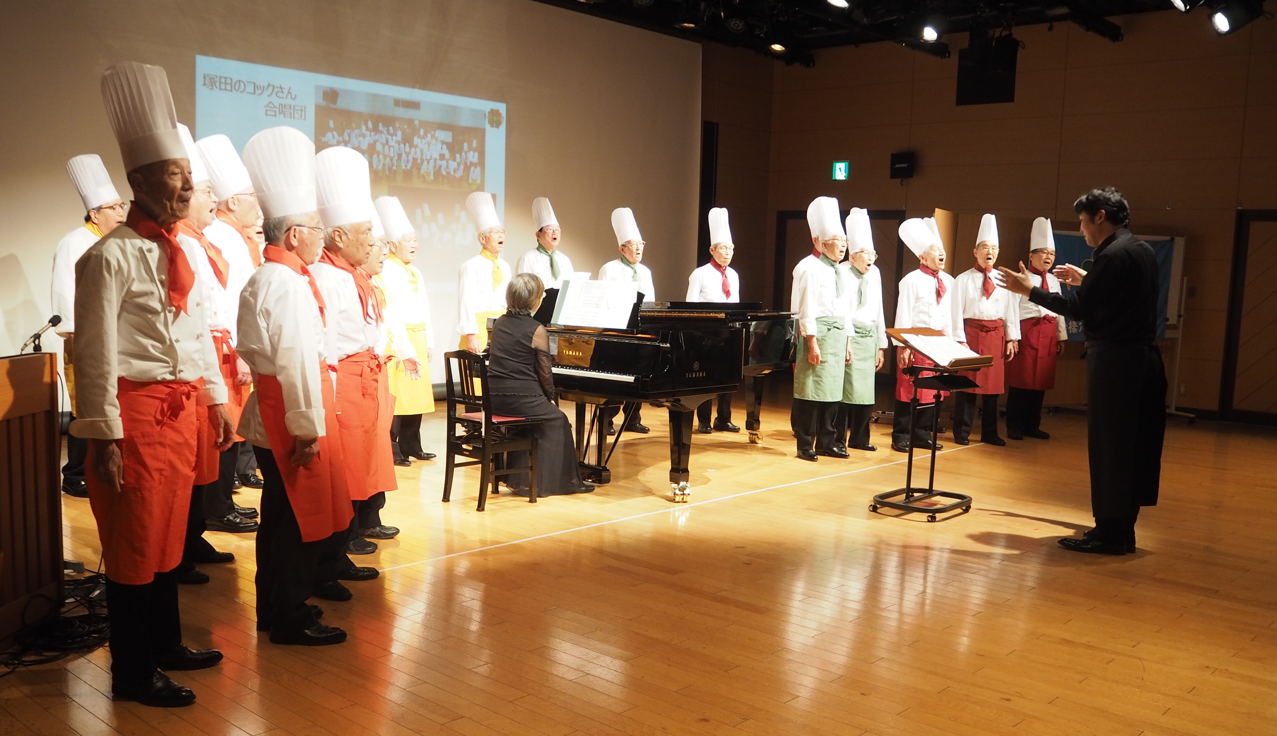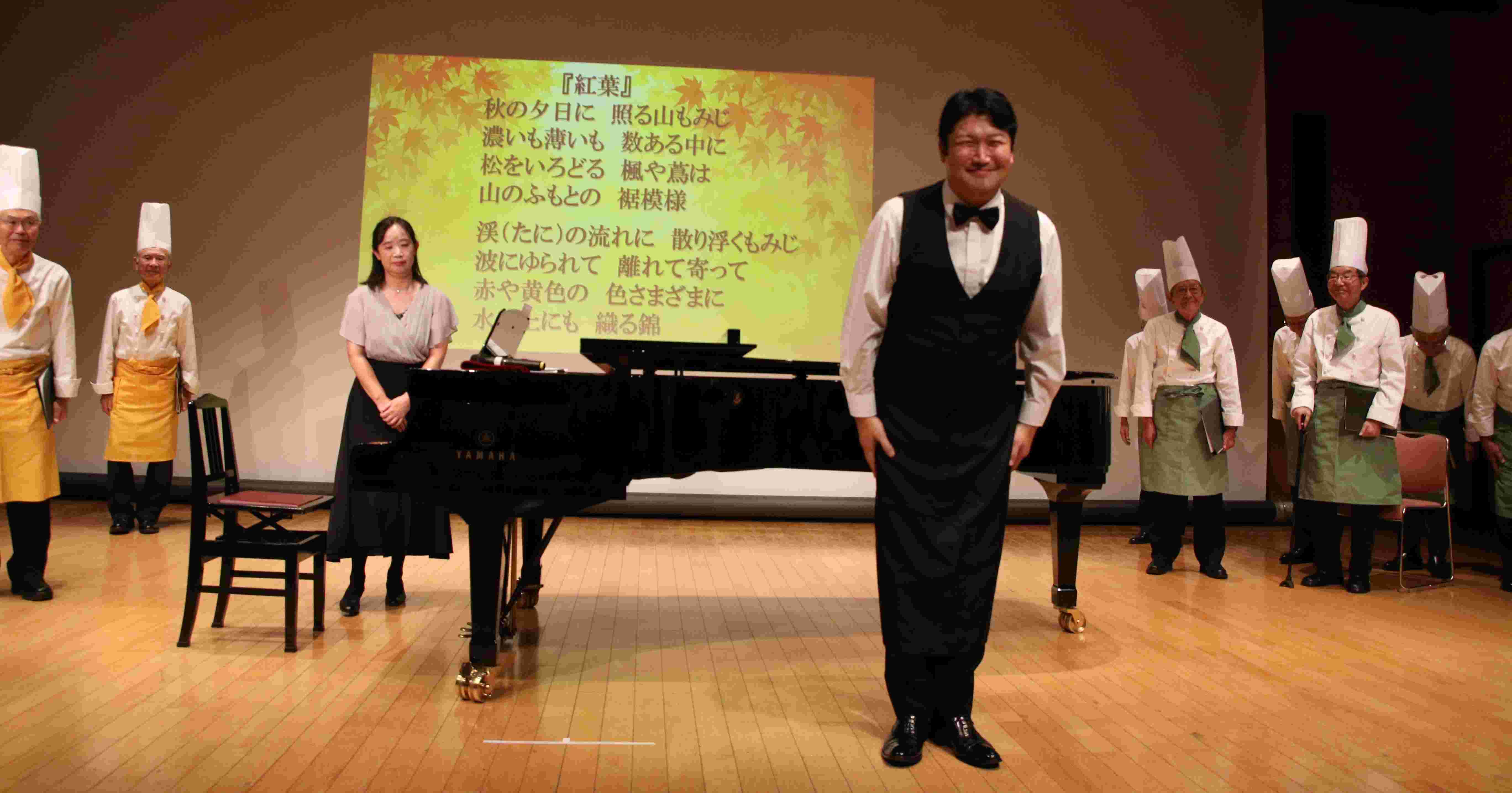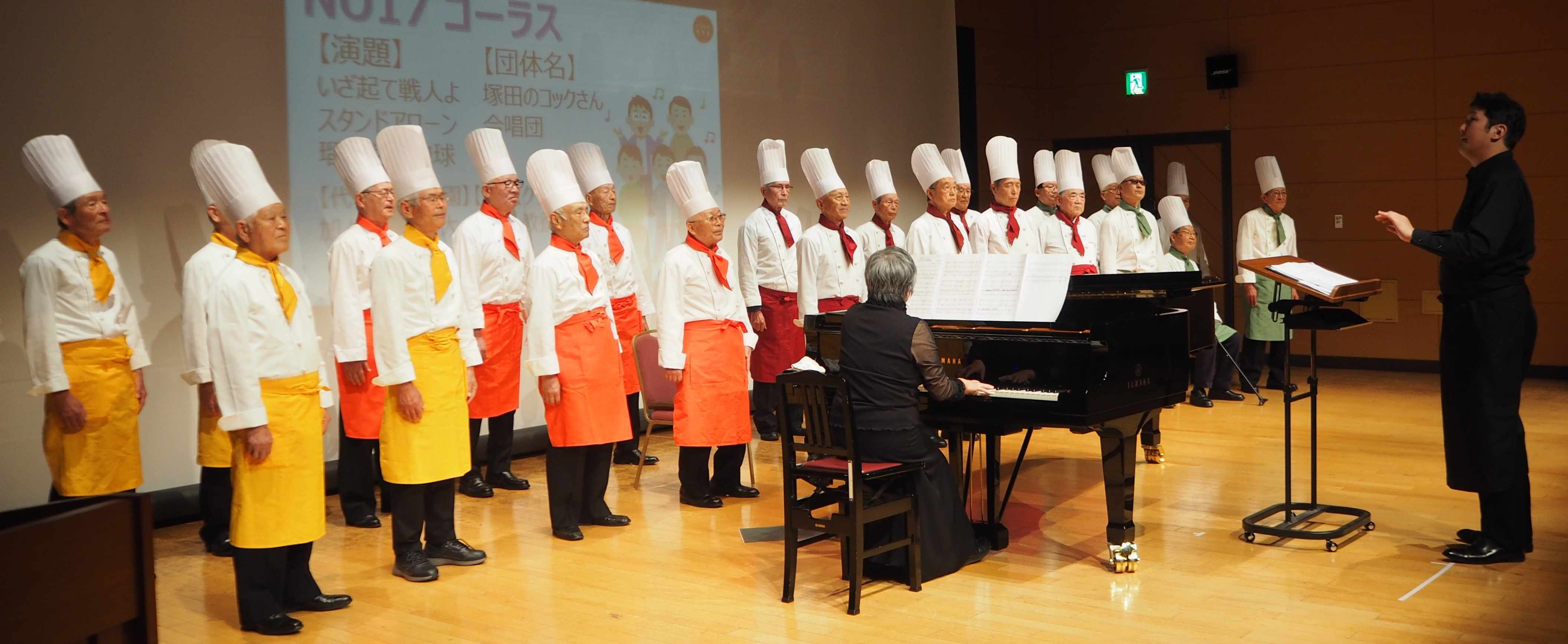 トリを飾ったのは「塚田のコックさん合唱団」平均年齢81歳の男声合唱団です テノール歌手でもある櫻井淳さんの指導の下、2年続けてシニアのコンクールで優秀賞を受賞しました