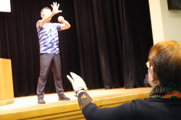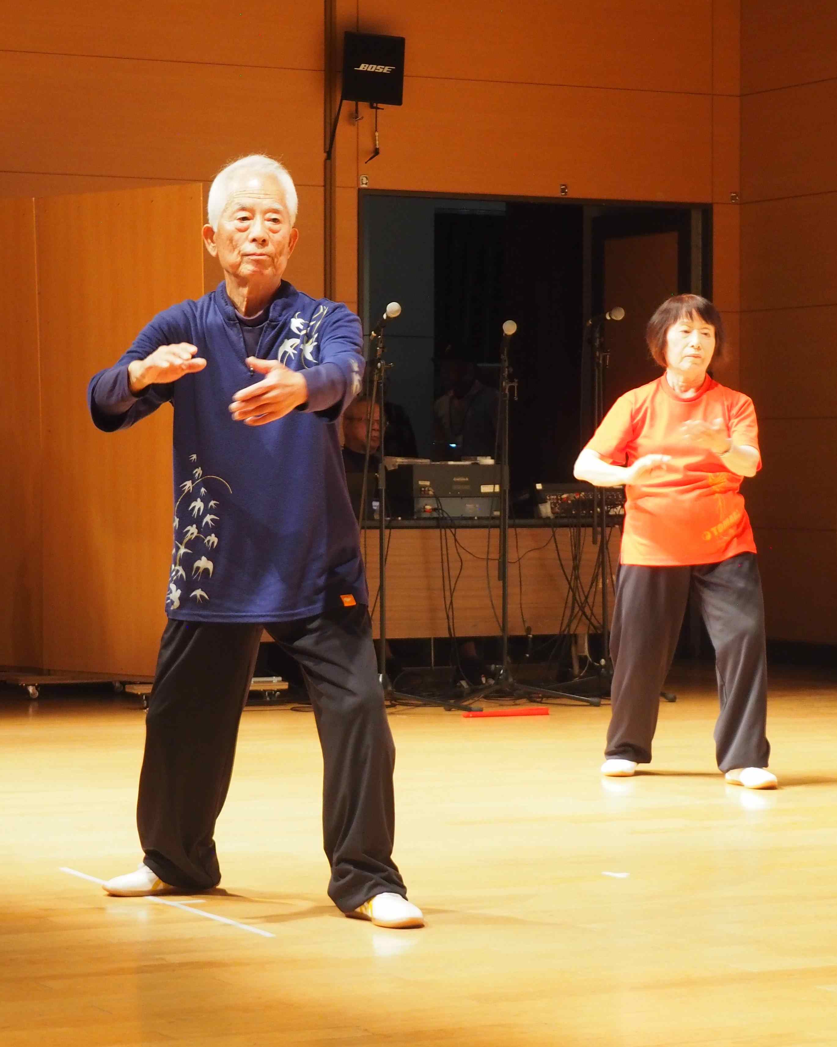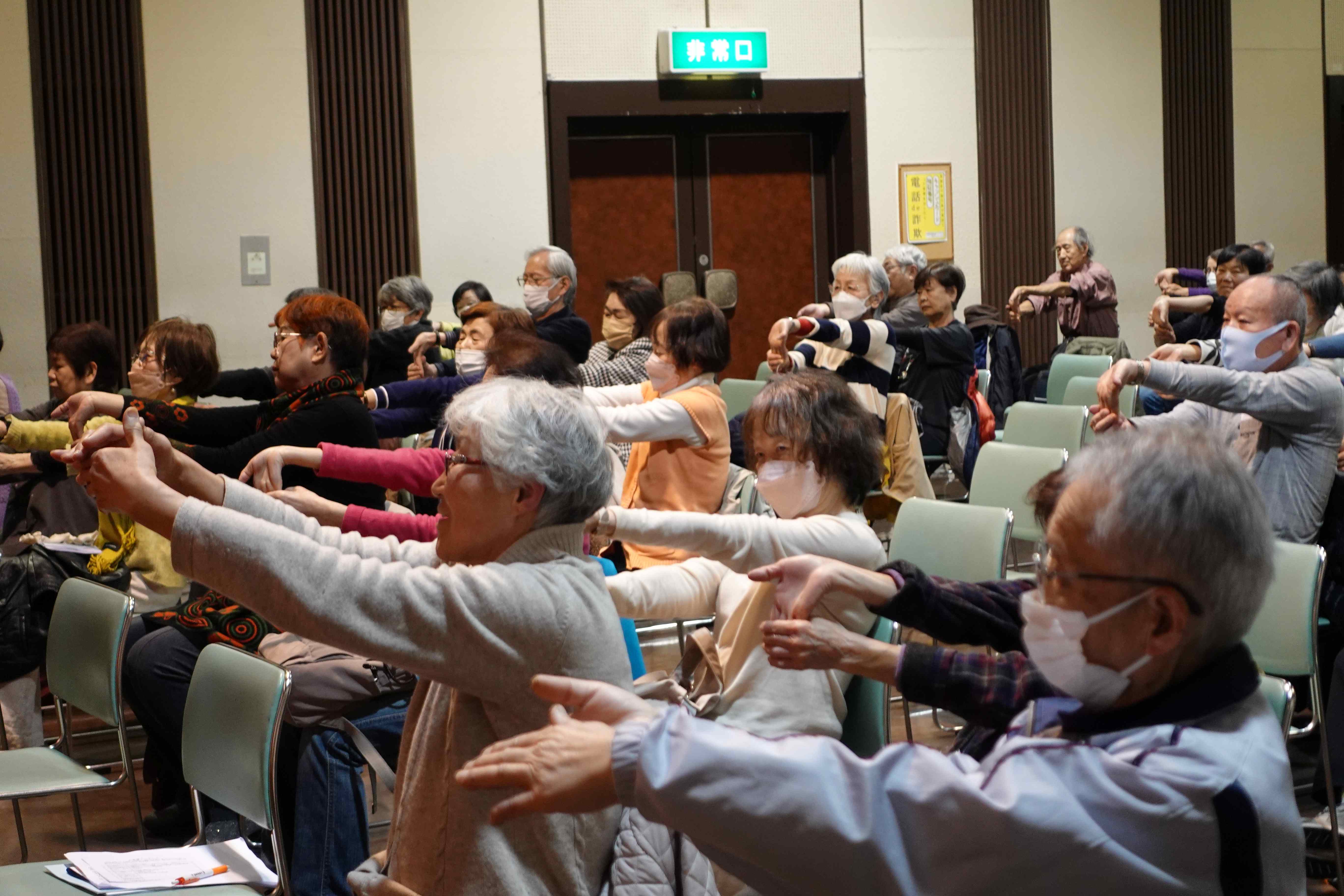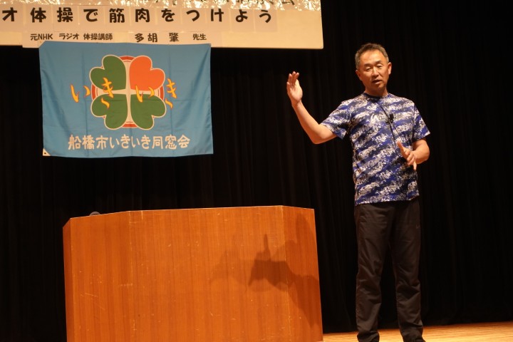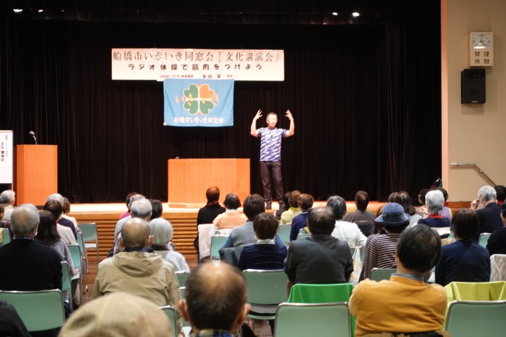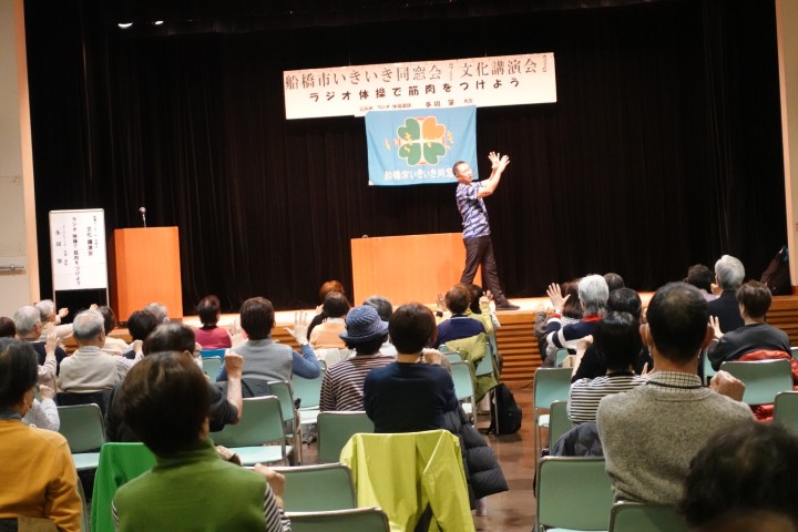多湖さんは「筋肉や骨、血管の柔軟性、記憶力、体のバランスなどは年齢と共に衰えてしまうもの。これらをどう補っていくかが健康に年齢を重ねていくためには不可欠」と長年ラジオ体操を教えてきた経験から日常の中での取り組みの大切さを紹介。そのための体の動かし方を実演と共に教えていただきました。参加者もそれぞれ体を動かし、楽しく有益なひとときを過ごすことができました。参加者90人。
