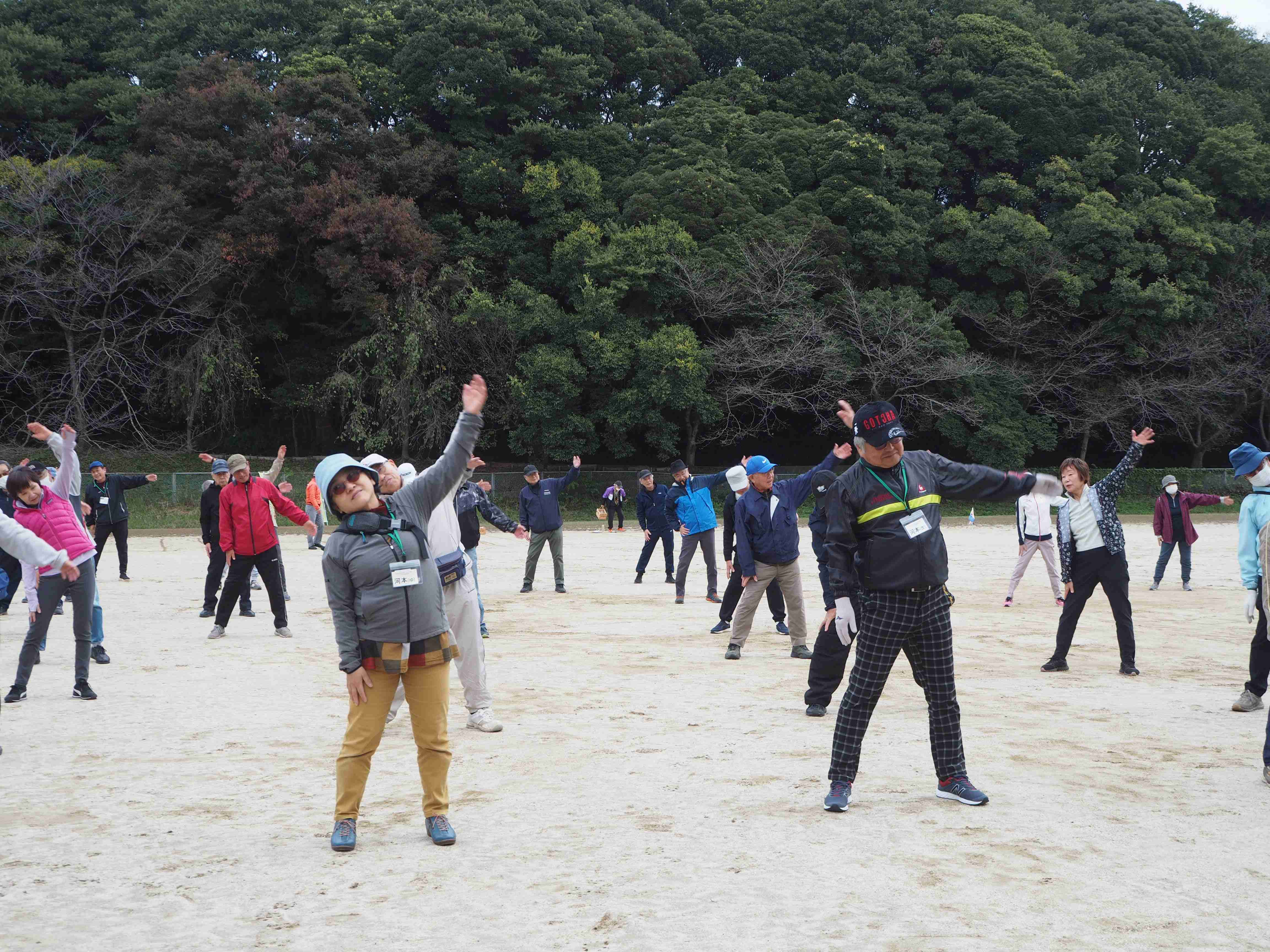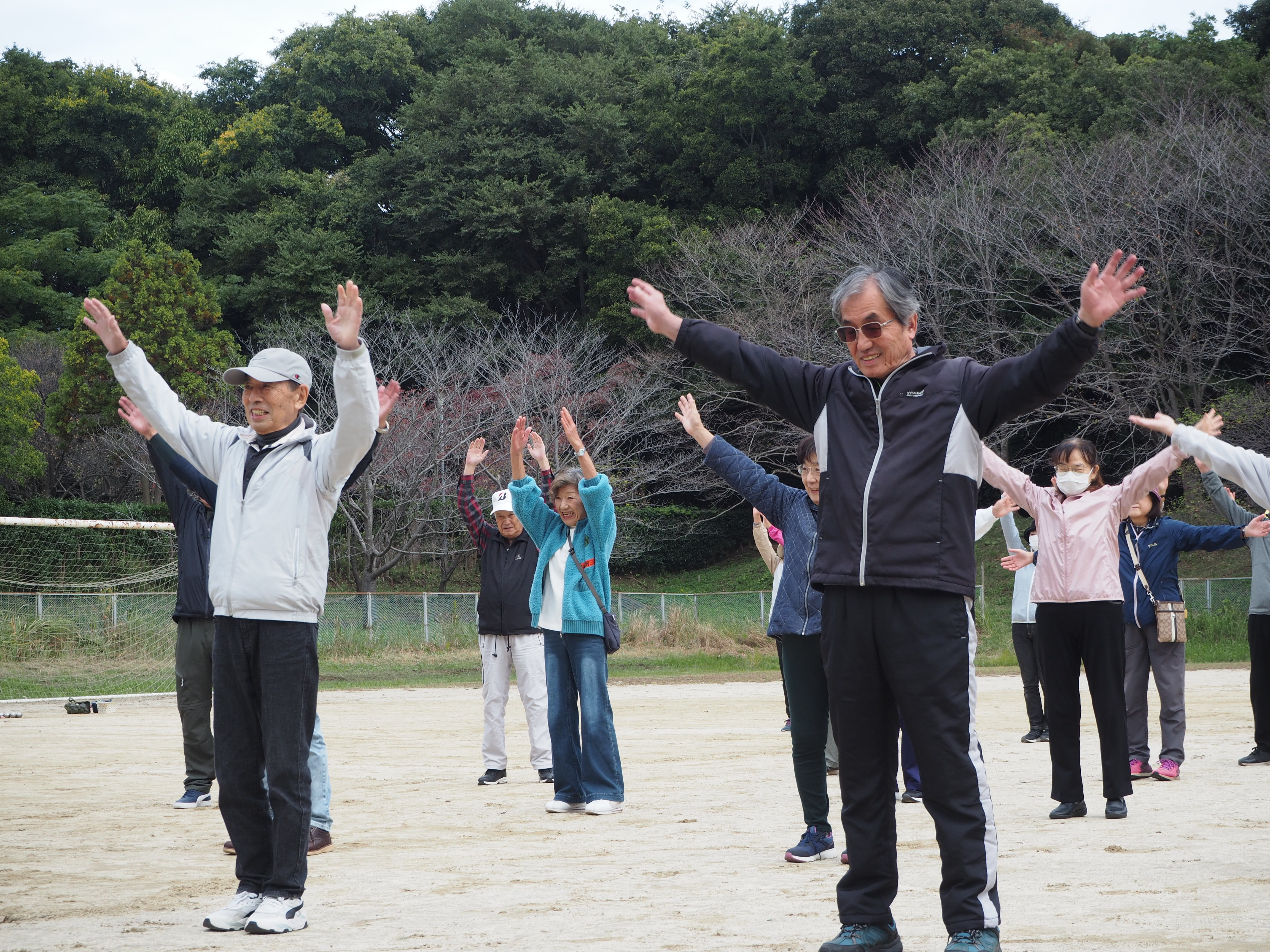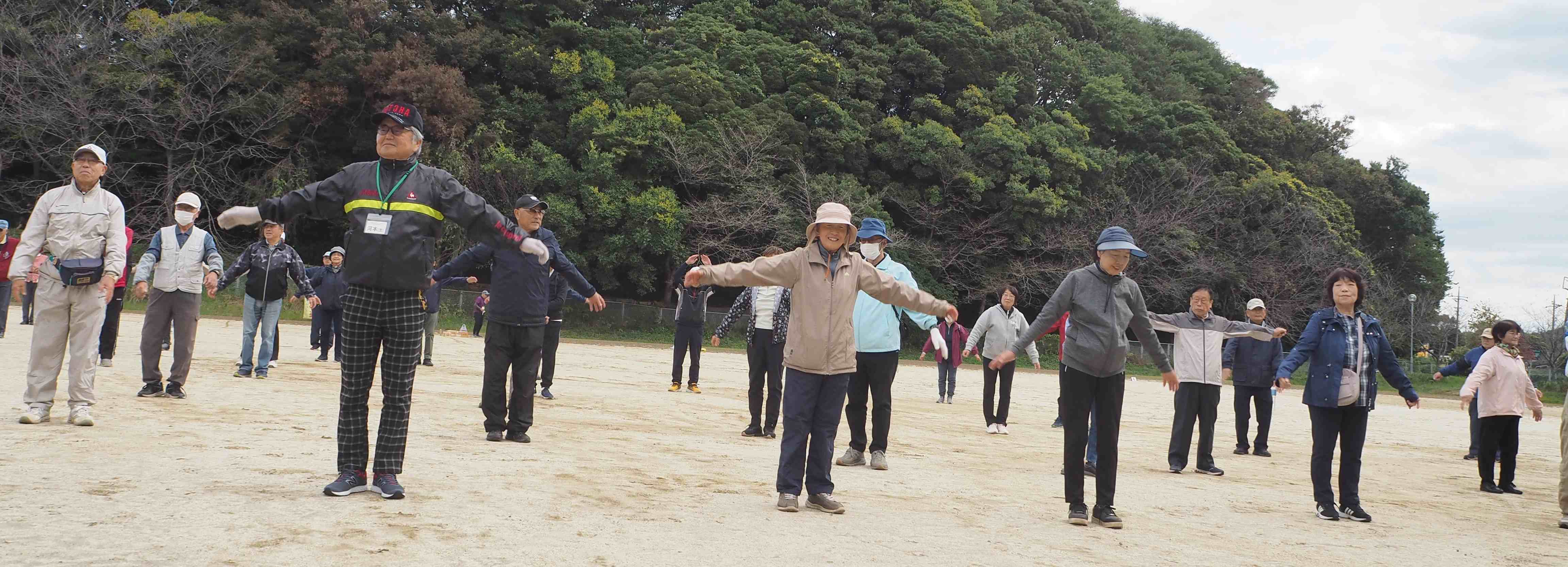 「運動やるで~」の声で始まりました。「腕を回してくんなはれ」などユーモラスなかけ声に、みんなの顔もにこやかに!