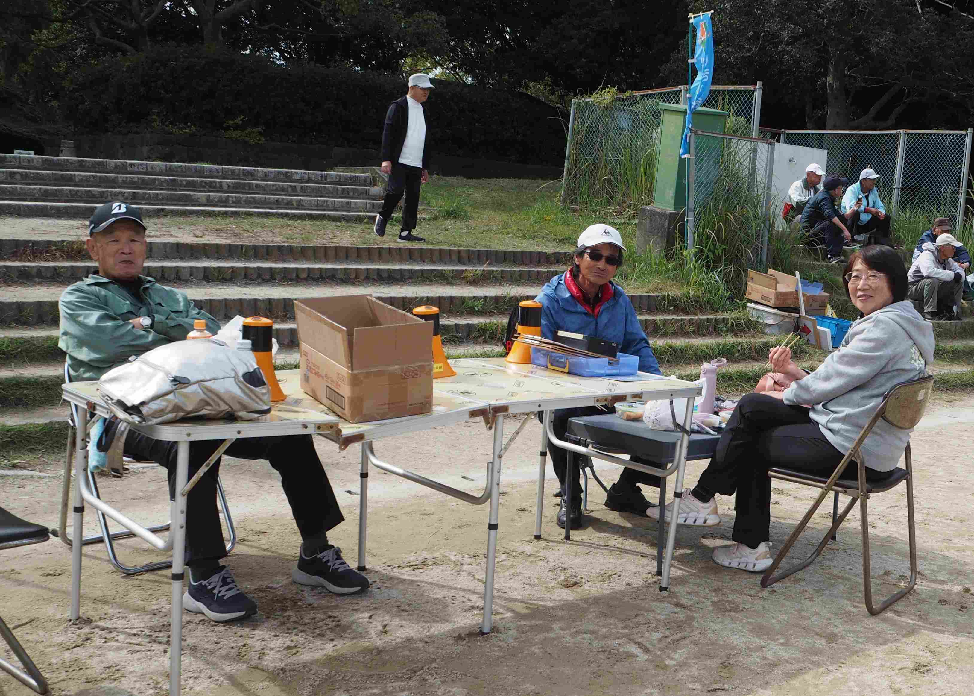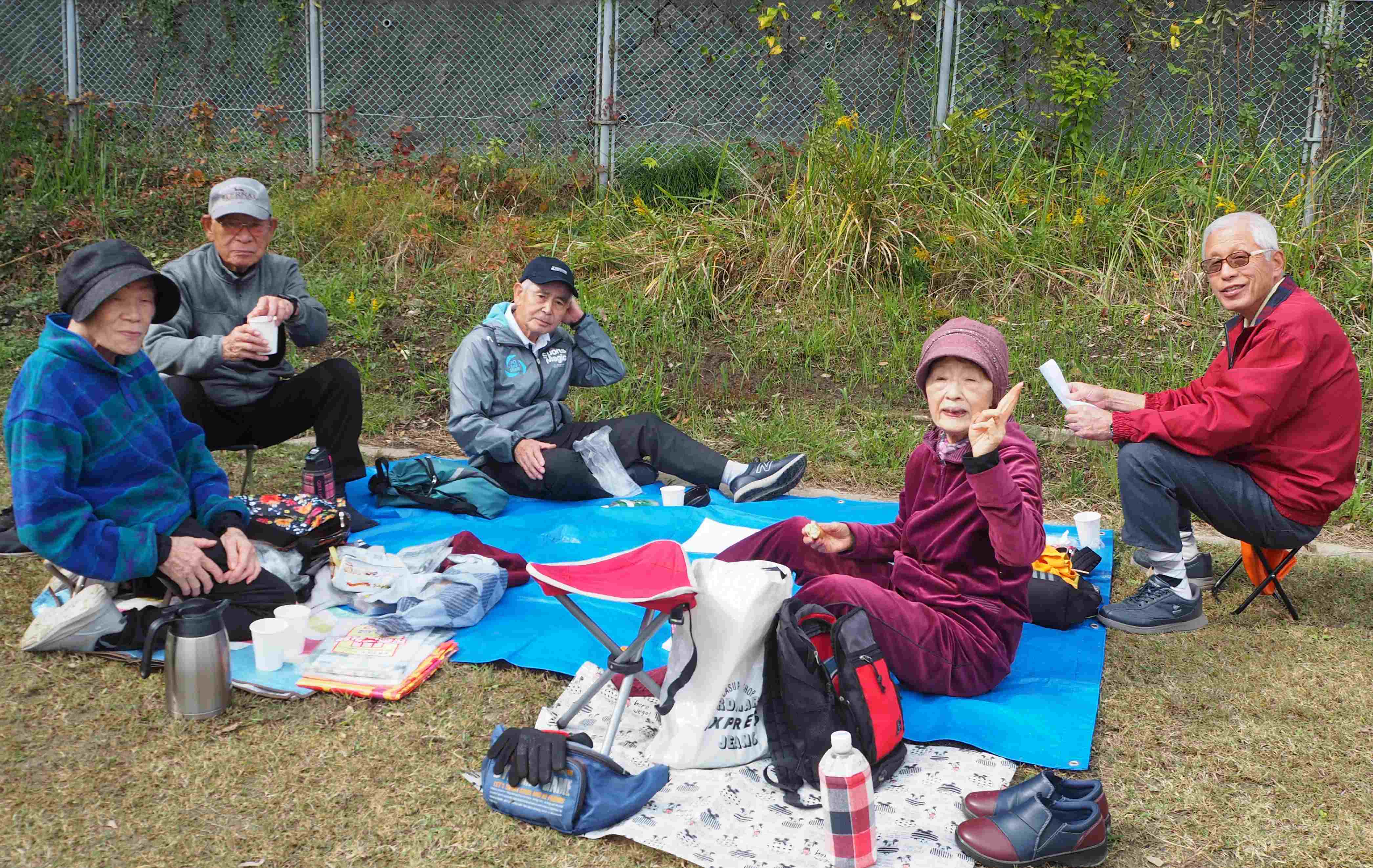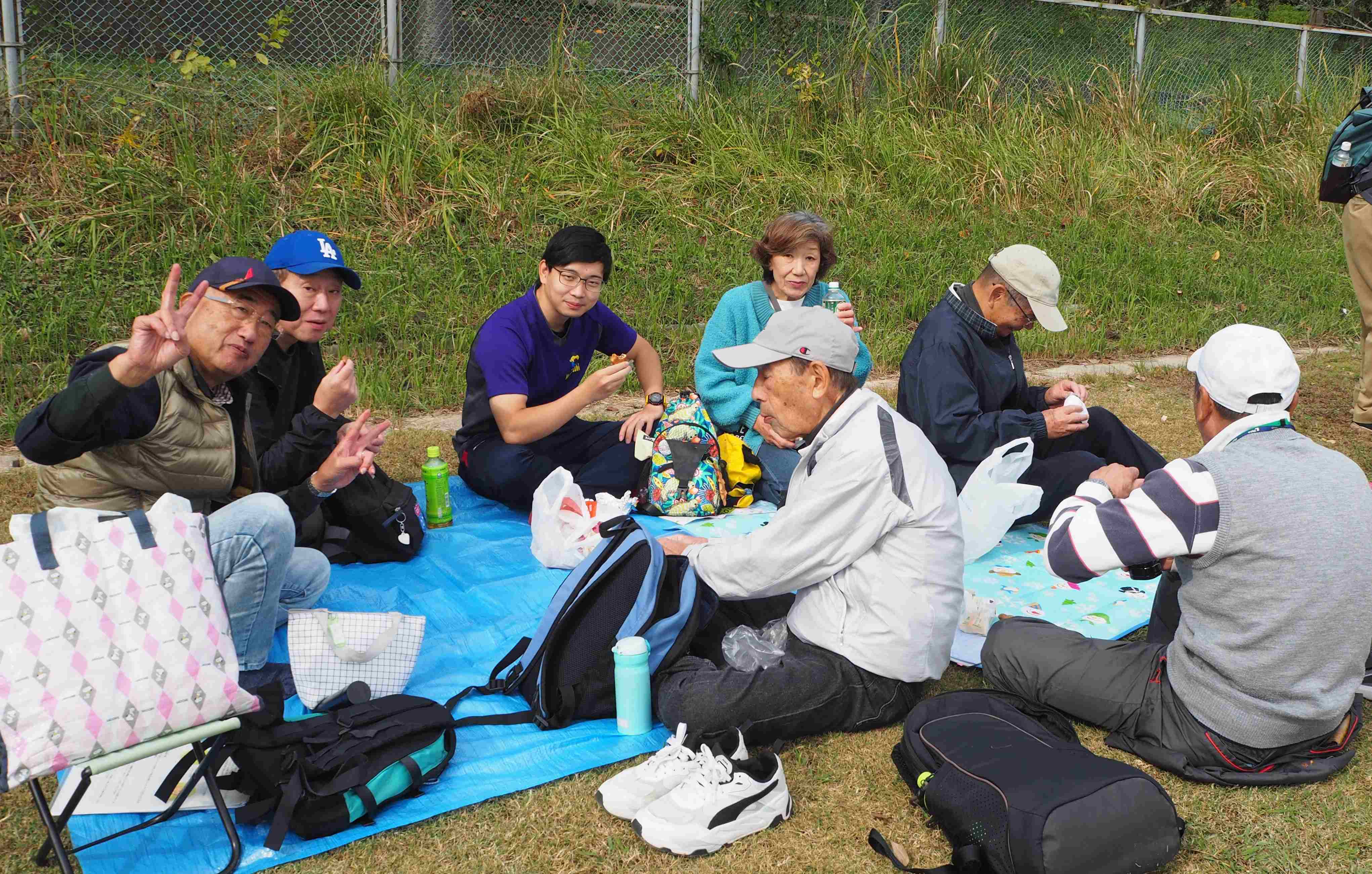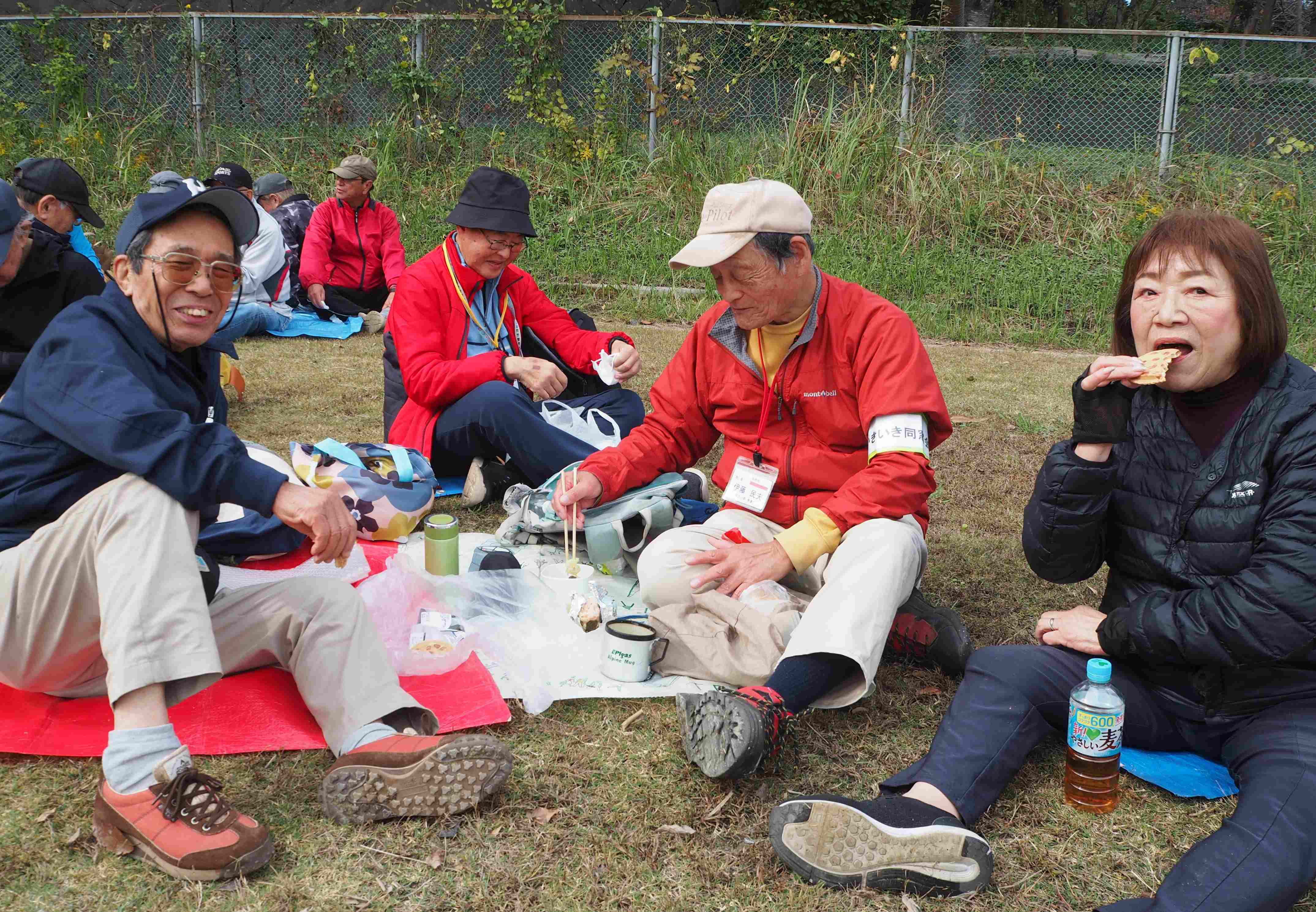 お楽しみのお昼です。果物やお菓子を分け合い和気あいあい。今年は市民大のスタッフの方がなんと有給休暇を取って参加して下さいました。WELCOMEです!!