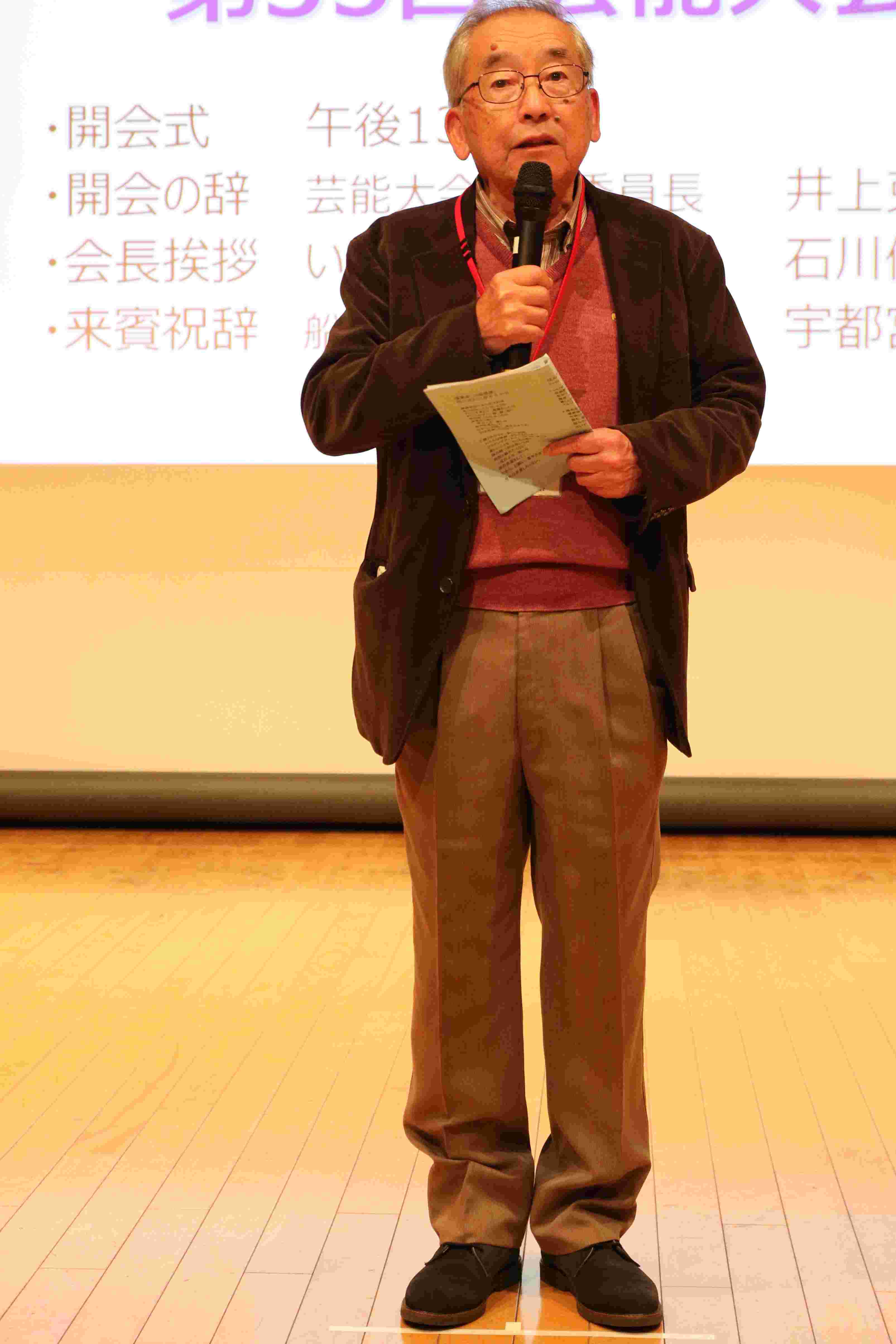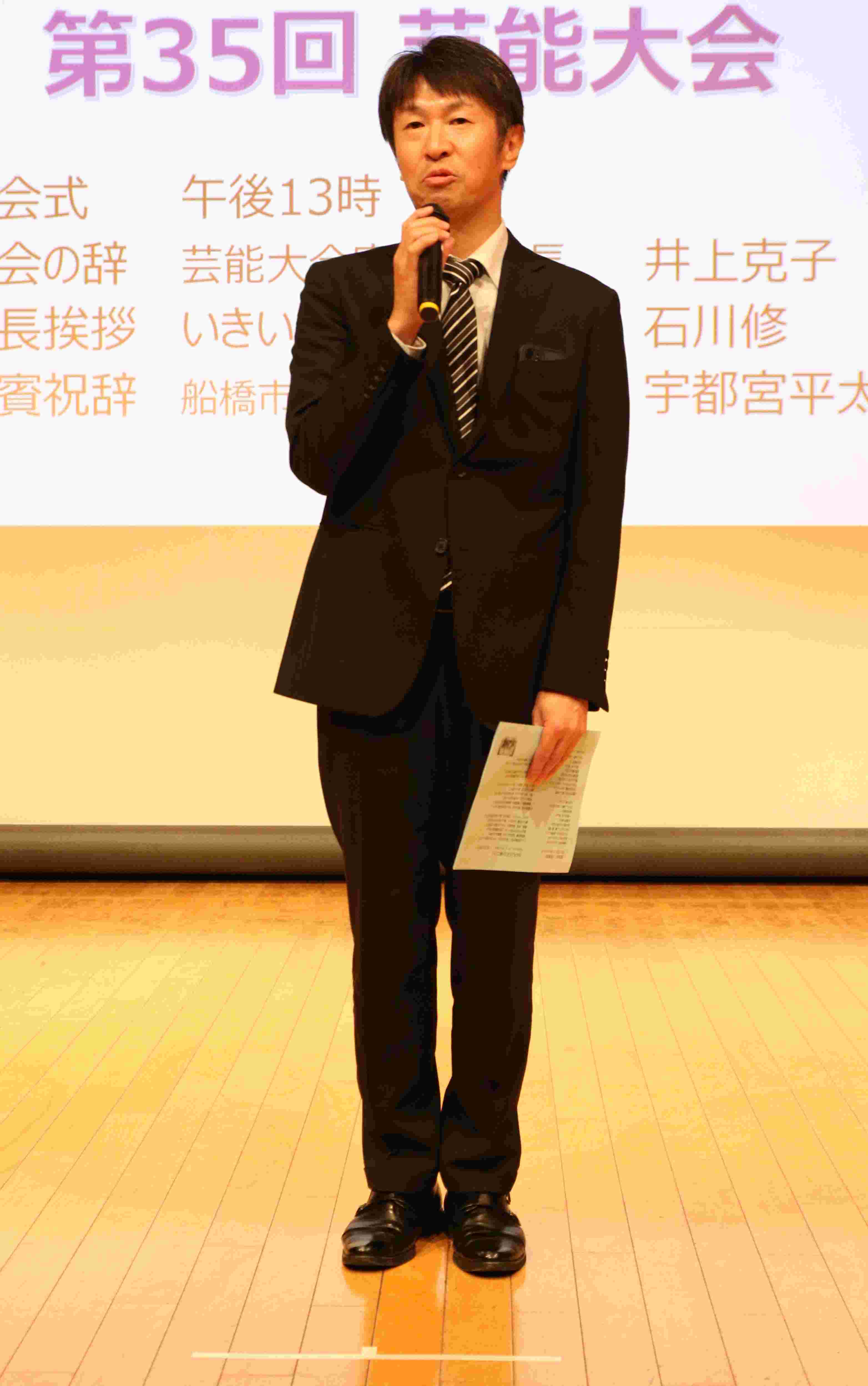 大会実行委員長井上克子さんの力強い開会宣言の後、石川修会長の挨拶、高齢者福祉課長の宇都宮平太さんのご挨拶で、いよいよスタートです。司会はアドリブも絶好調の金山文子さんです。