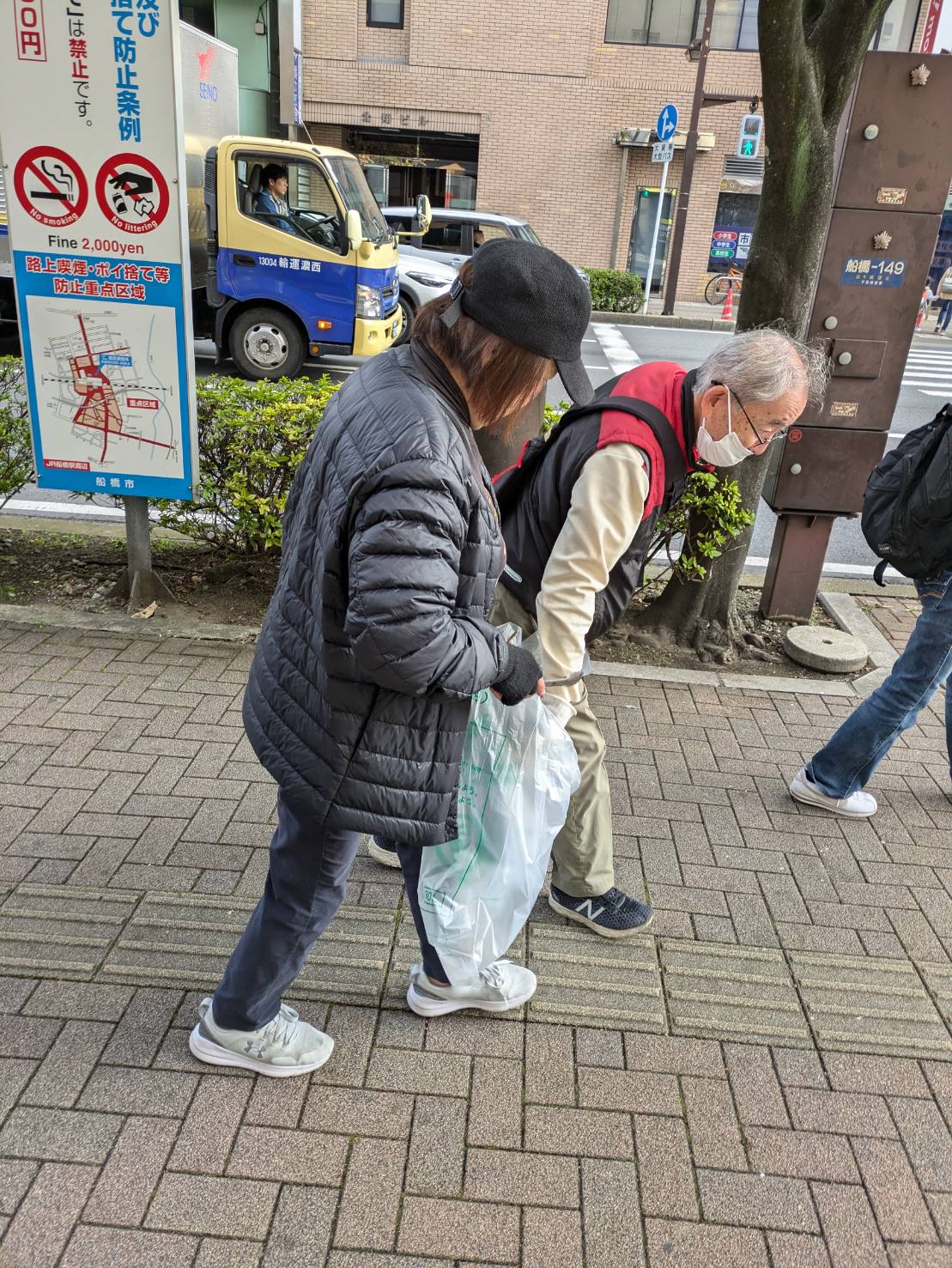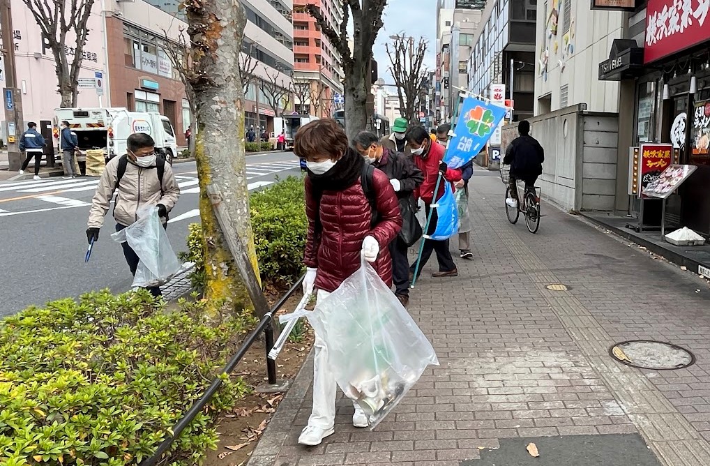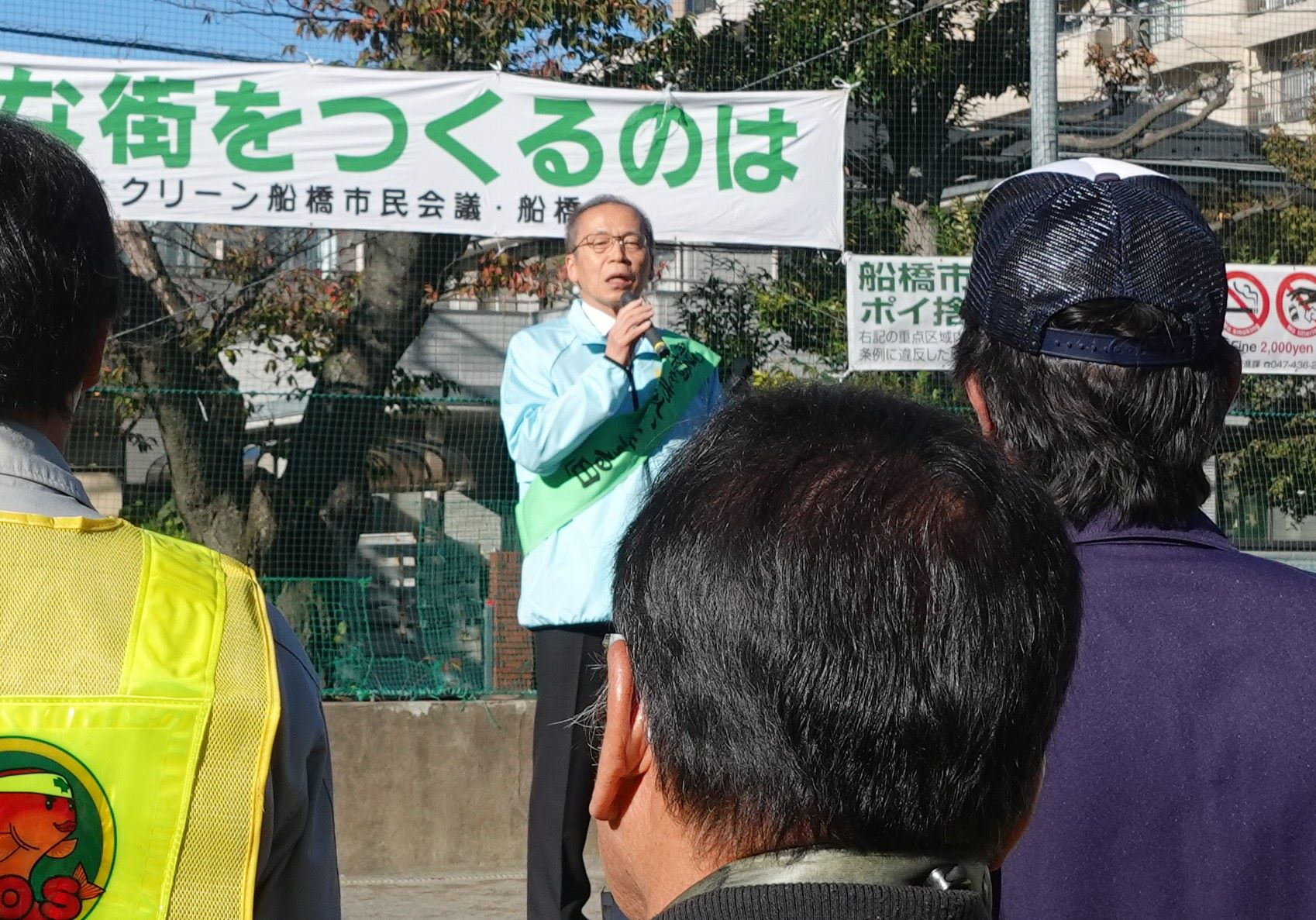 11月16日(水)船橋市主催の「船橋をきれいにする日」が行われ、いきいき同窓会も参加しました。朝9時に中央会場である天沼弁天池公園に集合、松戸徹市長などの挨拶のあと、各コースに分かれて清掃作業に出発しました。同窓会に割り当てられたコースは、JR駅を通って駅南口から駅前通り沿いに14号道路の手前まで。市内の各企業や、自治会等多くの団体が一斉にごみを拾い始めました。放置されているごみの量は年々少なくなっているようでした。