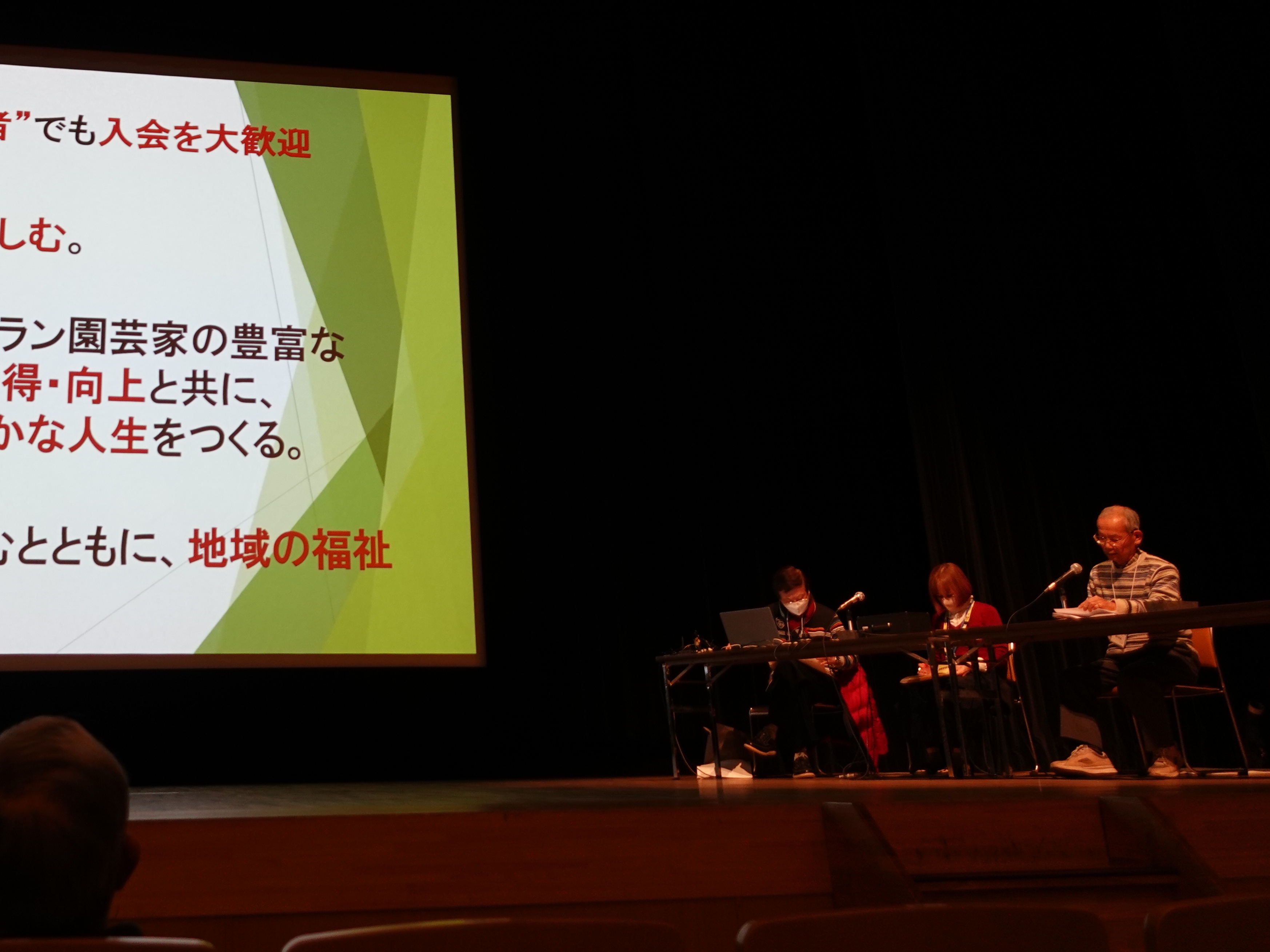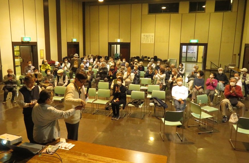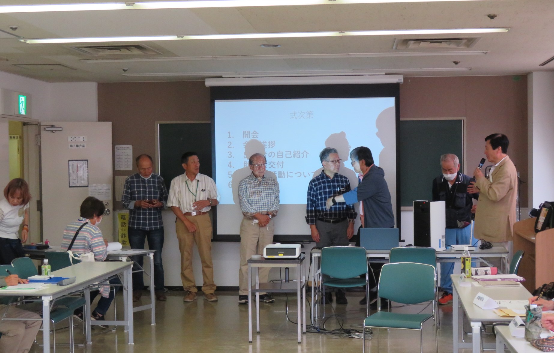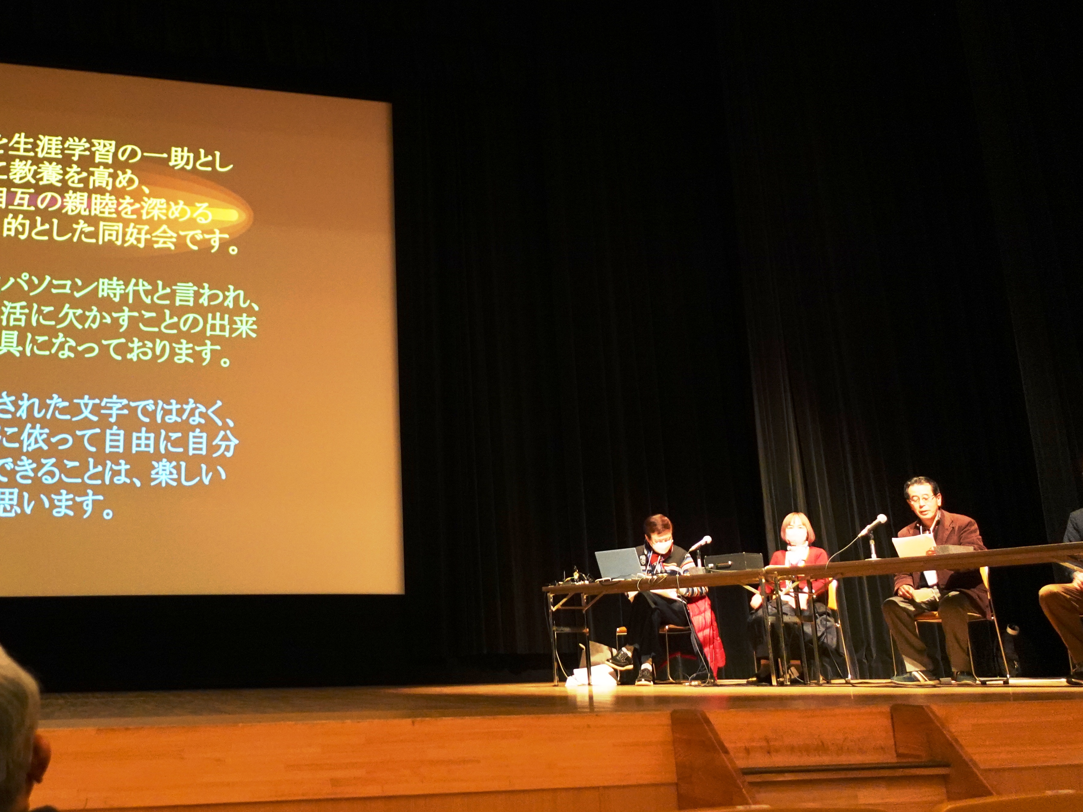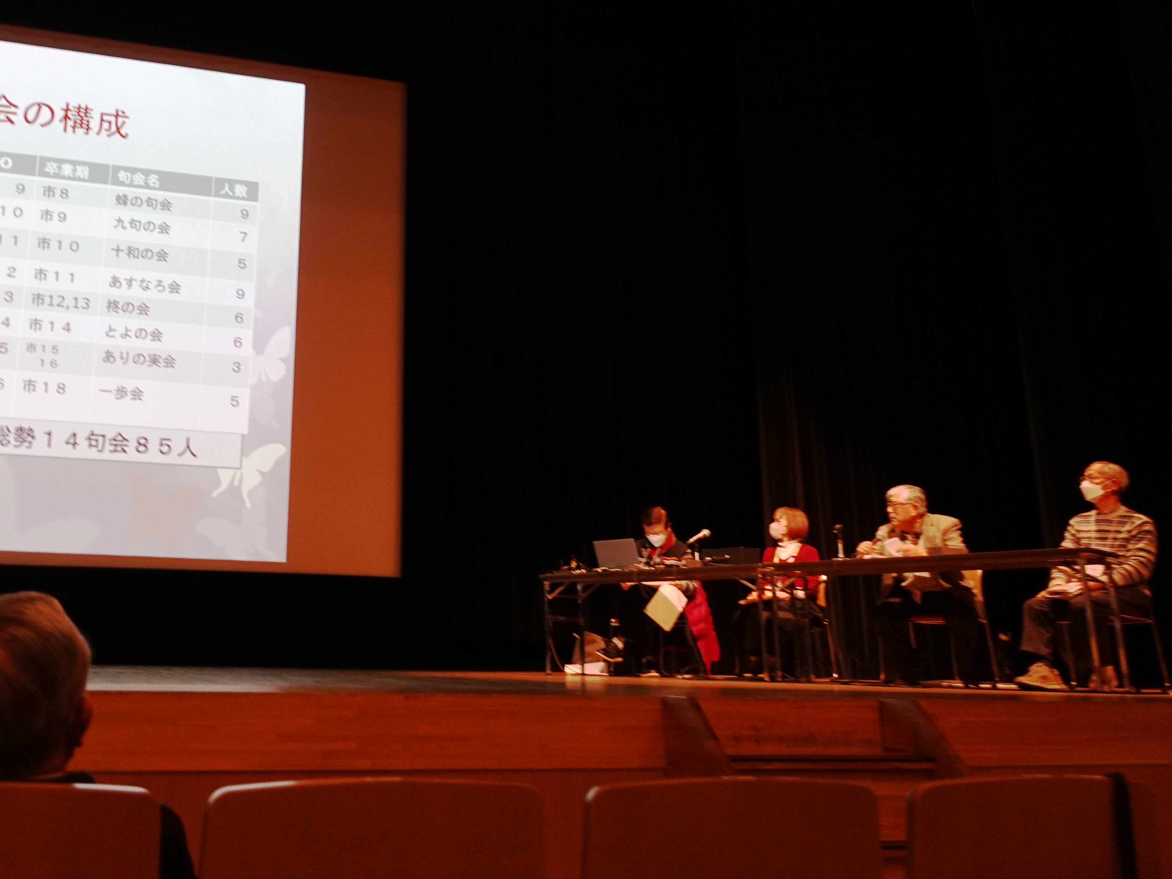 大きなスクリーンで同窓会とその活動の紹介、同窓会所属の各同好会の活動の様子などを紹介しました。写真や動画を使ったプレゼンテーションは見応えがあり、それぞれの同好会の力の入れ方が伝わってきました。歴史と実績のある同好会、出来立ての同好会、大人数の同好会、少数精鋭の同好会と様々ですが、市民大学卒業後も仲間といろいろな分野で楽しむことができる同窓会ならではの魅力が伝わったと思います。