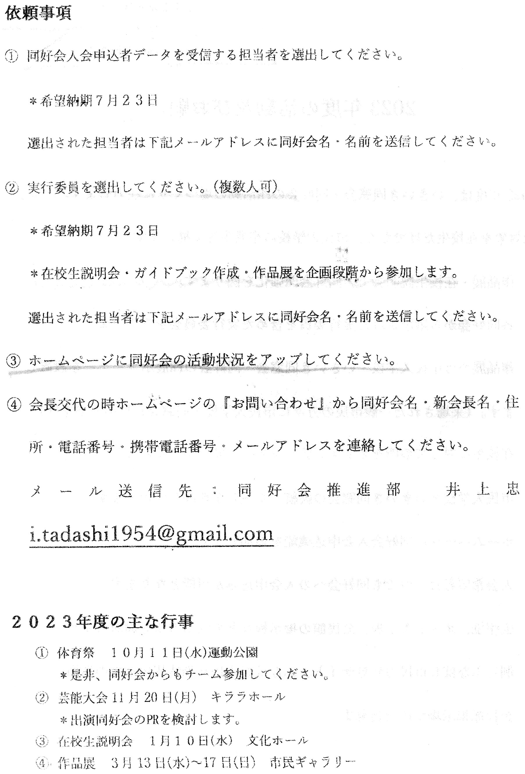 各同好会から22年度活動報告、会計報告と23年度活動計画、予算に加え、同好会名簿、23ガイドブック紹介文などを提出。