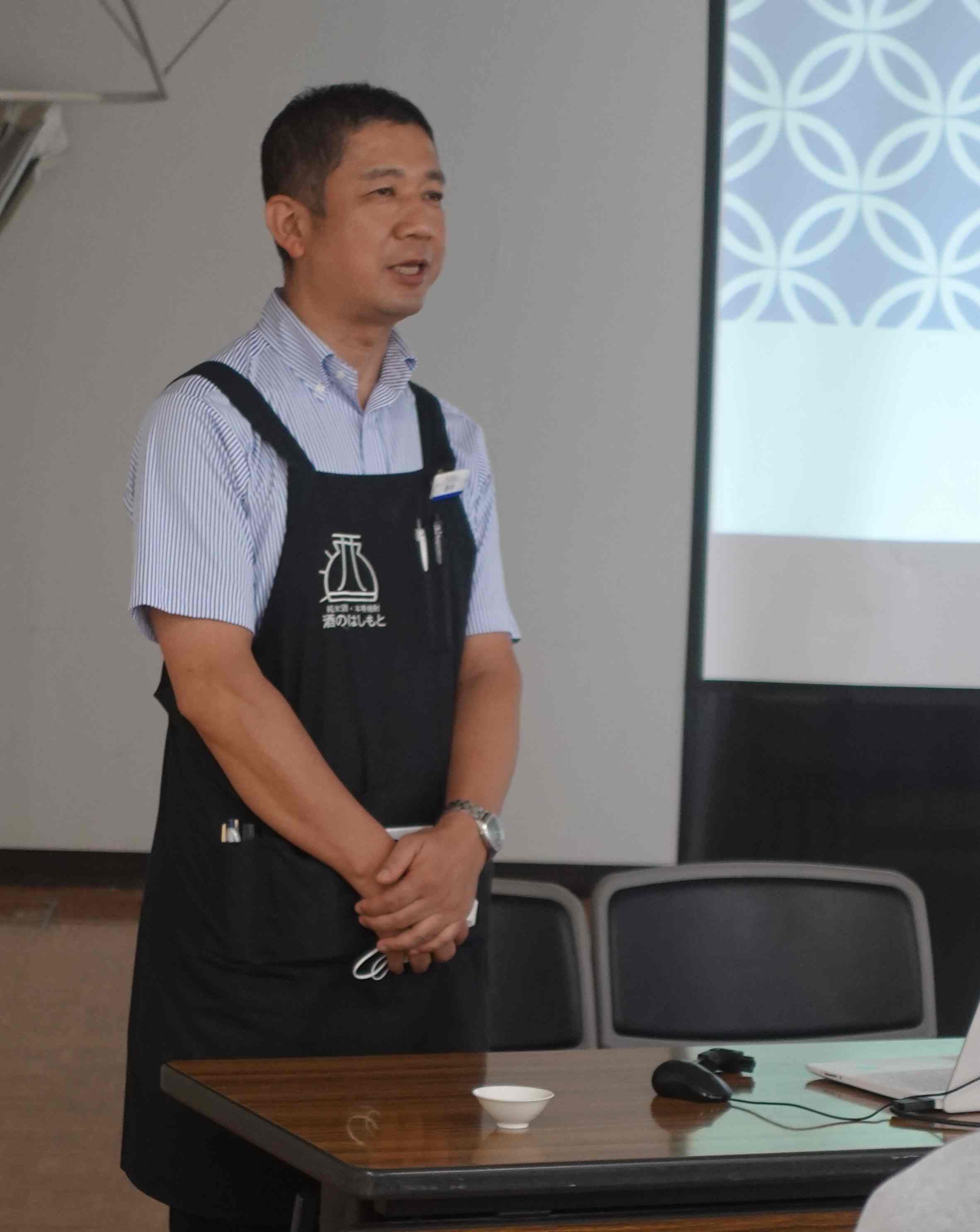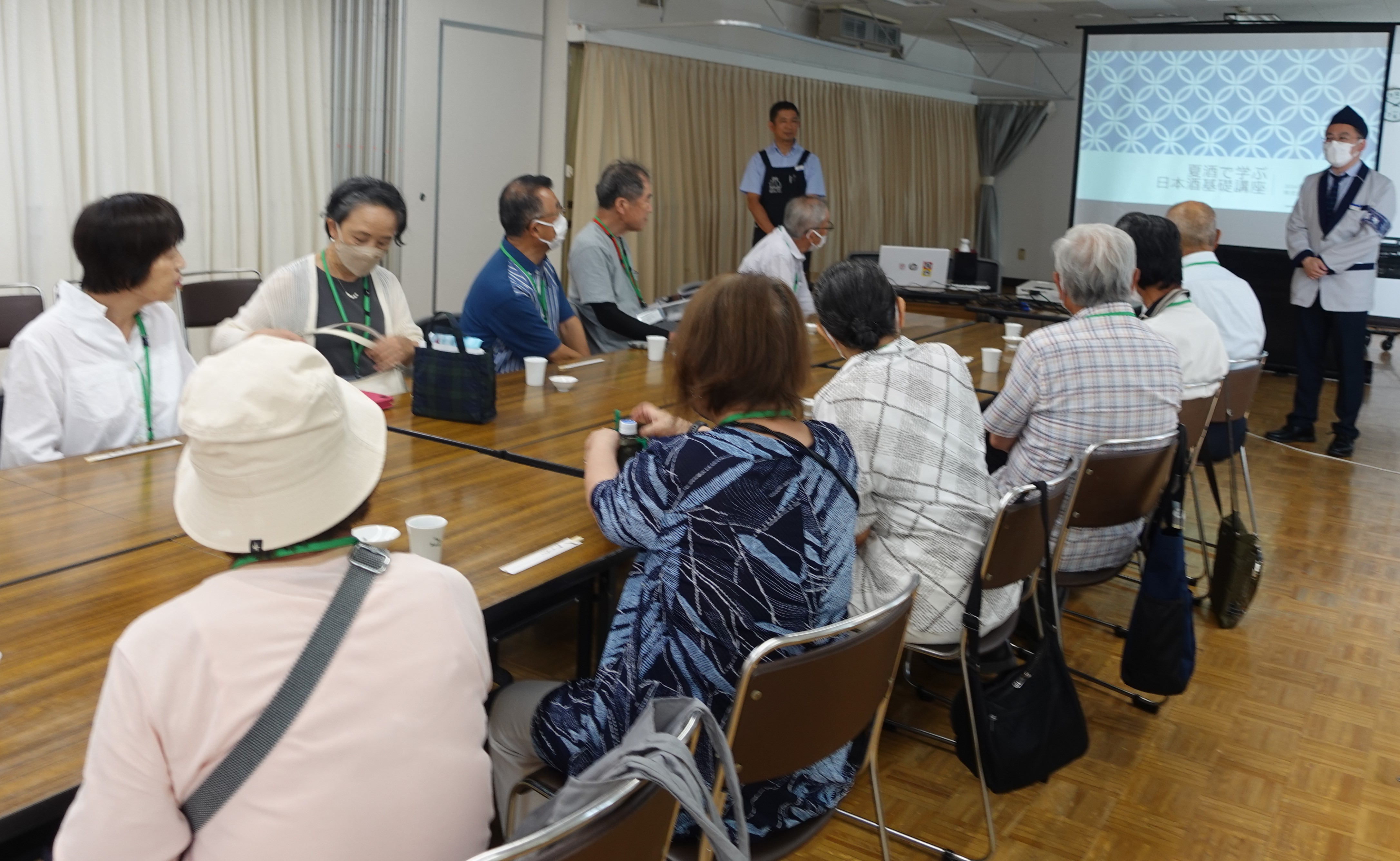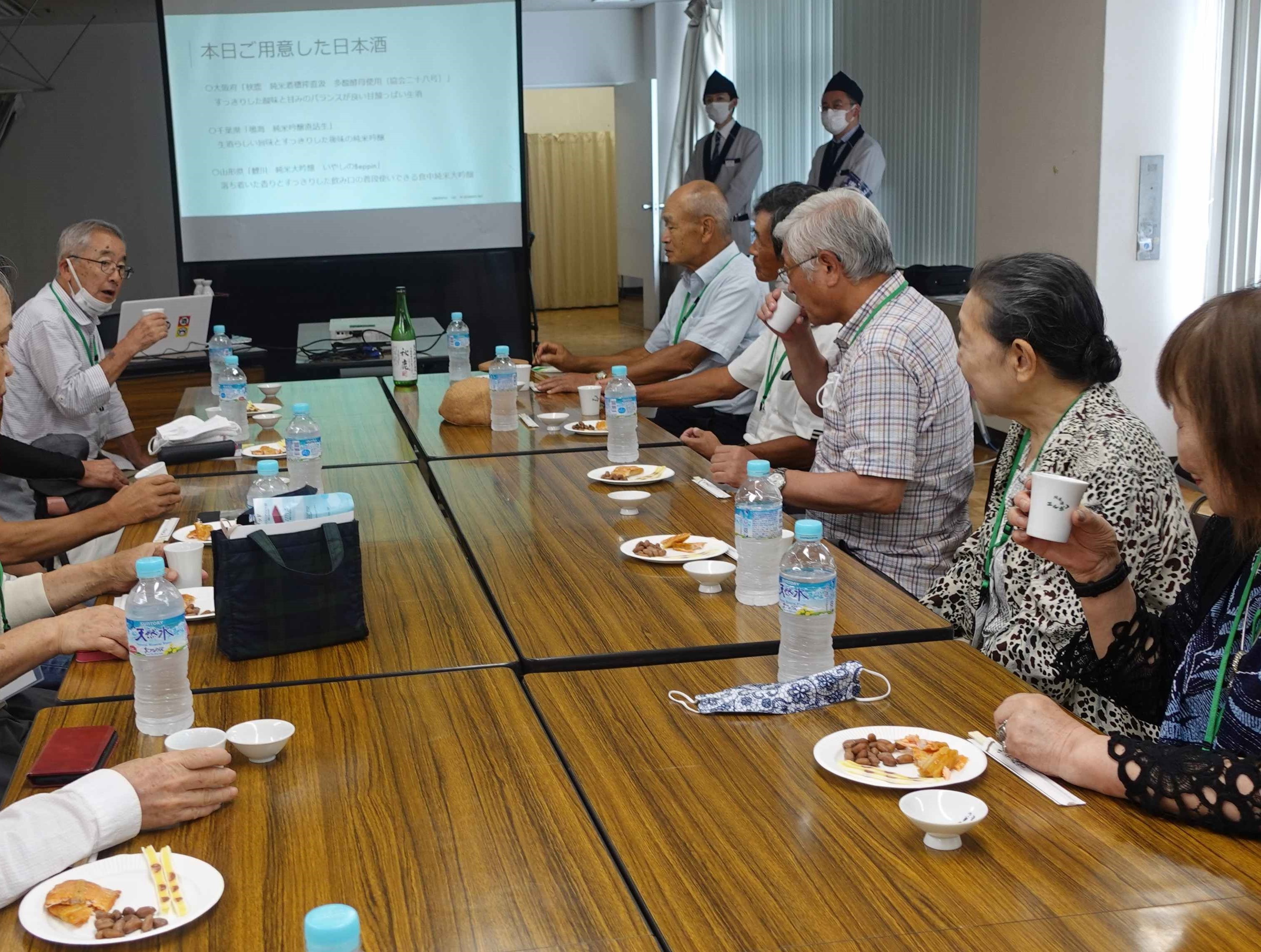 4階に移動して日本酒のプロによる「お酒と肴のマリアージュ」と題した講義、そしてお楽しみの試飲と試食タイムです。この日用意していただいたのは大吟醸や、濁り酒、地元千葉のお酒などの5種類。習志野台にある「酒のはしもと」の田中元さん(東武地下1階のお酒売り場担当)から、それぞれのお酒の特徴やラベルから読み取れるお酒造りへのこだわりなどをお聞きしました。また冷や燗のほか濁り酒のソーダ割りといった飲み方も紹介していただきました。いただくほどにお話にも花が咲き、予定時間を過ぎるほどの盛況でした。