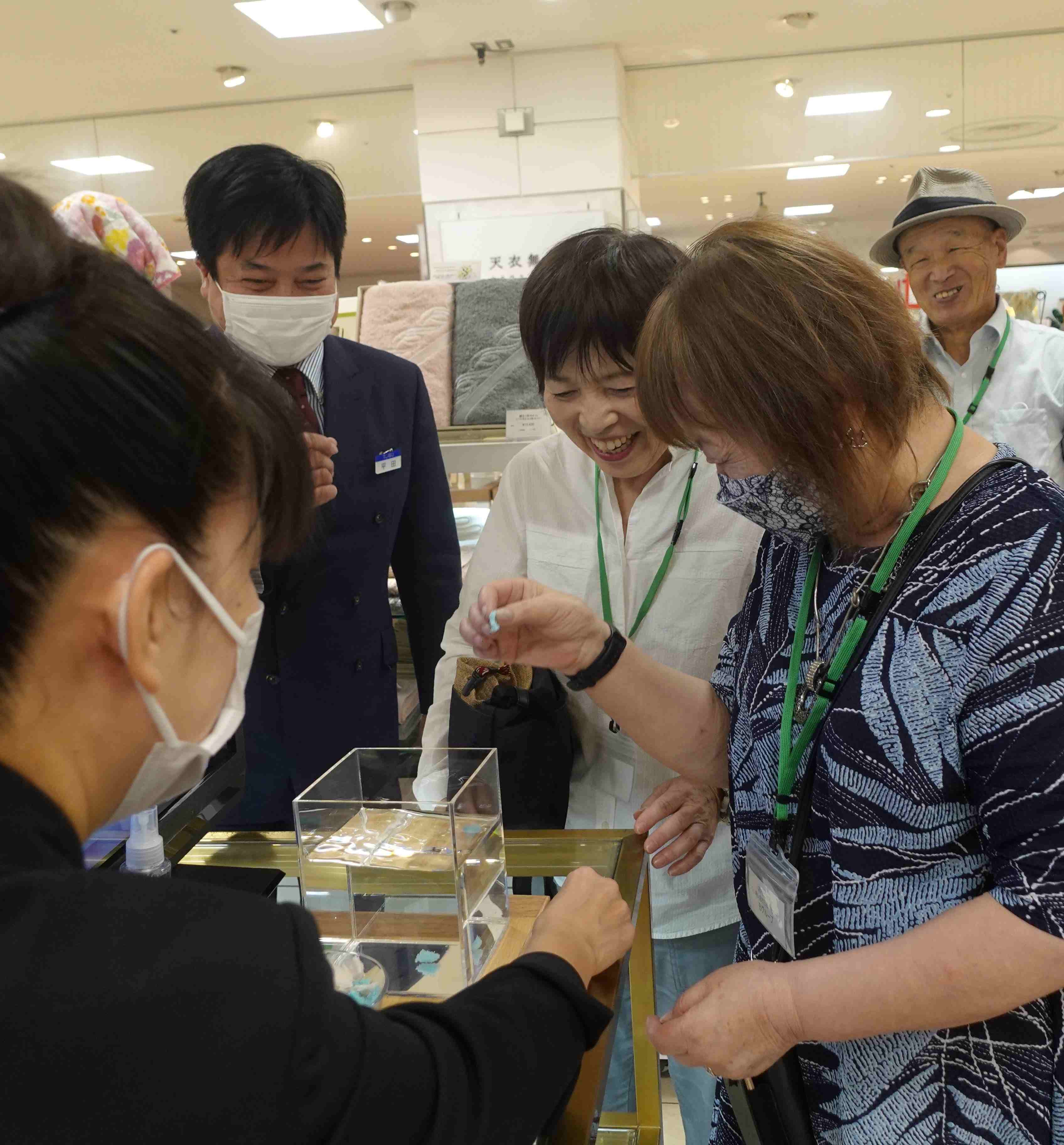 タオル売り場では明治時代から続く老舗が製造している「1秒タオル・ホットマン」の優れた吸収性の実証実験を体験しました。あっという間に水分が吸収される実力に、「孫用にプレゼント」「旅行用に持って行きたい」と言う声があがっていました。