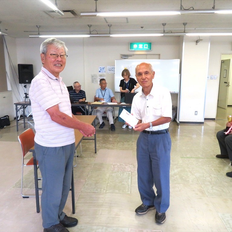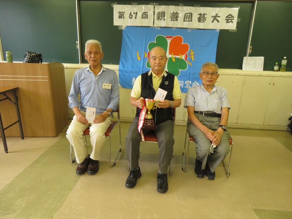 市民大6期生として74歳で卒業し、囲碁には3級で参加させて頂きました。ところが、なかなか優勝にいたらず、碁会所で修行してやっと3年目に優勝し2級に昇格。その後は比較的順調に優勝を重ね、7~8年で1級、初段、二段となったところでコロナ時代に突入。大会も延期の連続で、待ちに待った今回、実戦から遠ざかっていましたので、思いもよらぬ優勝ができました。それと、私にとって今年は88歳になる「米寿での優勝」とあって格別なものとなりました。次回は、三段でAクラス入りになれば、精進し頑張りたいと思います。生きている限り囲碁を楽しみたいと思っています。有難うございました。