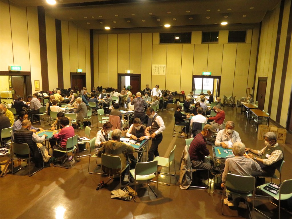 72名(18卓)の同窓生が参加。会場の講堂が狭く感じられるほどの賑わいとなりました。正午に、石川会長の挨拶、前回優勝者の大金さんからの優勝カップ返還、ルール説明が行われ、競技がスタート。競技は時間制で、1試合60分間を3回行い、合計得点を競いました。