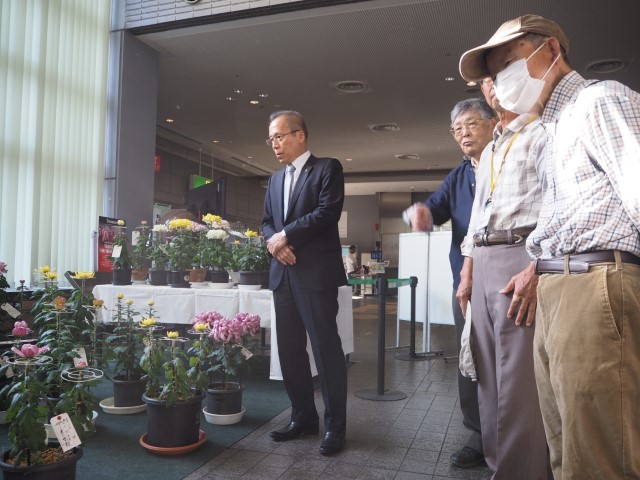 「植物は手をかけた分だけ答えてくれます。咲かない花はありませんから」八葉会の会員の方々から菊作りの苦労や醍醐味など話を聞きながら、見事な菊を熱心に鑑賞されていました。