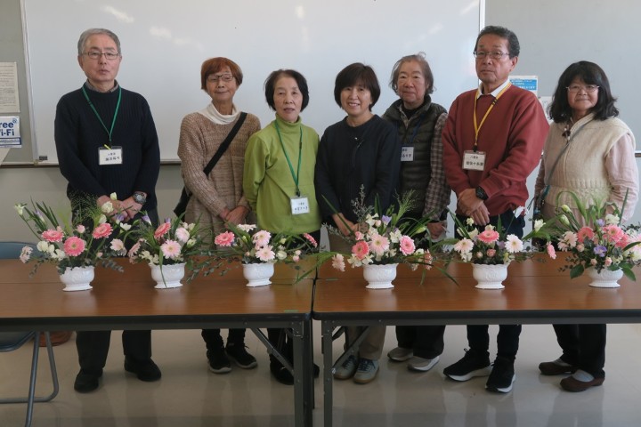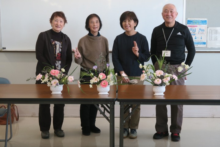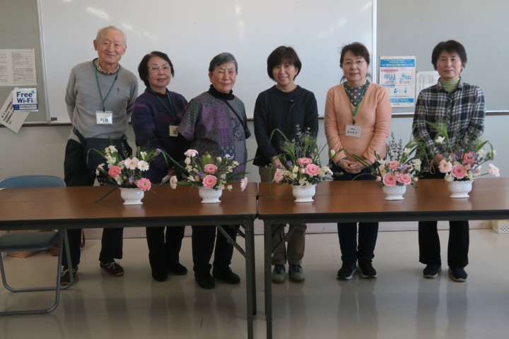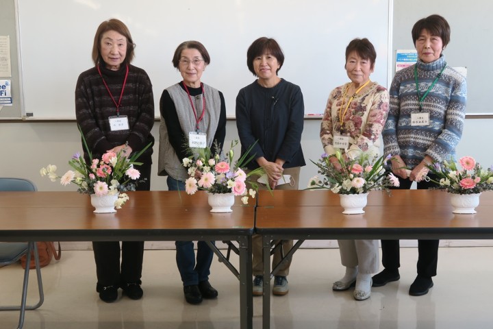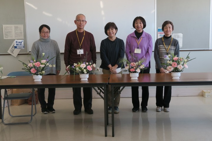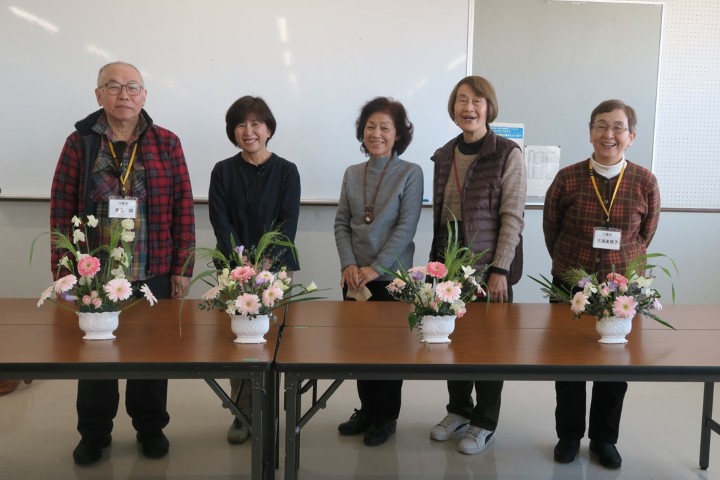 1月17日、定例活動として外部講師を招きガーベラ、スプレーバラ、フリージア、スイトピー、スモークグラス、ユーカリ、計6種の花材を用いて「フラワーアレンジメント」を作成しました。それぞれの作品をご覧ください。(写真をクリックすると大きくなります)