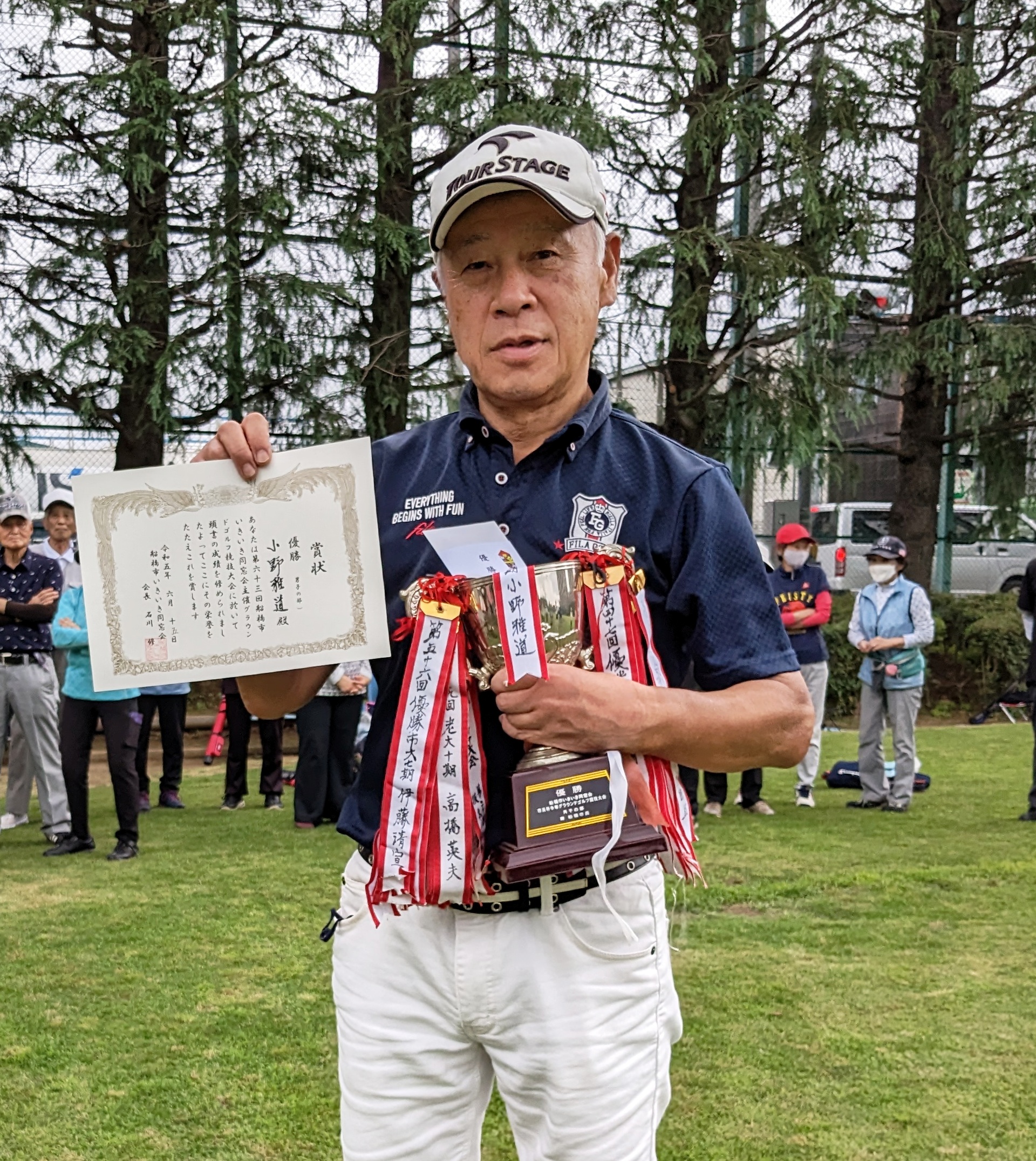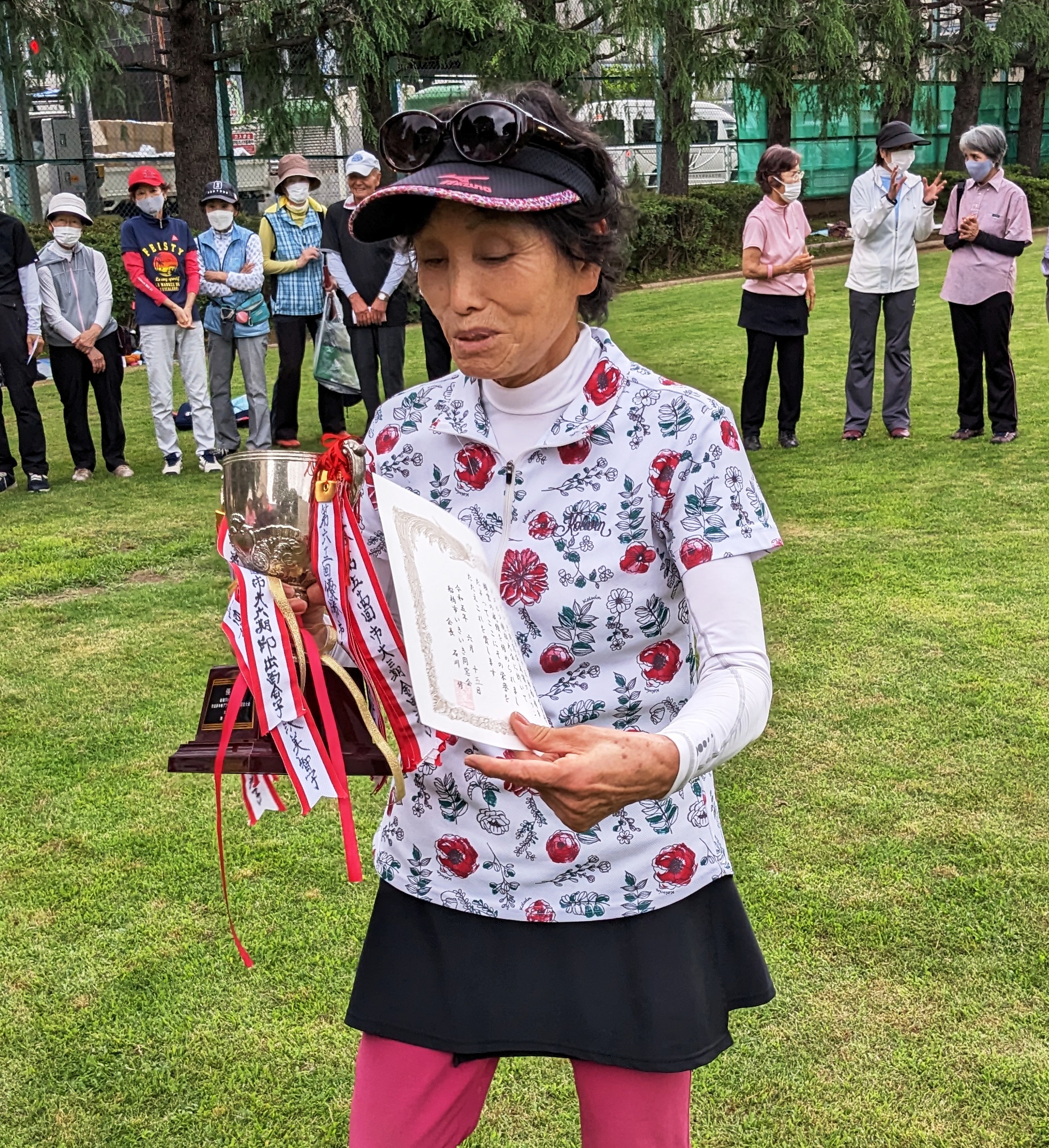グラウンドゴルフを始めて6年目、初の雨上がりの大会でした。ボールが前に飛ばず思い切り叩く様な振りになったのが、私の様な体力があるものには良かったのではないでしょうか。たぶん今回が最初で最後の優勝になると思います。