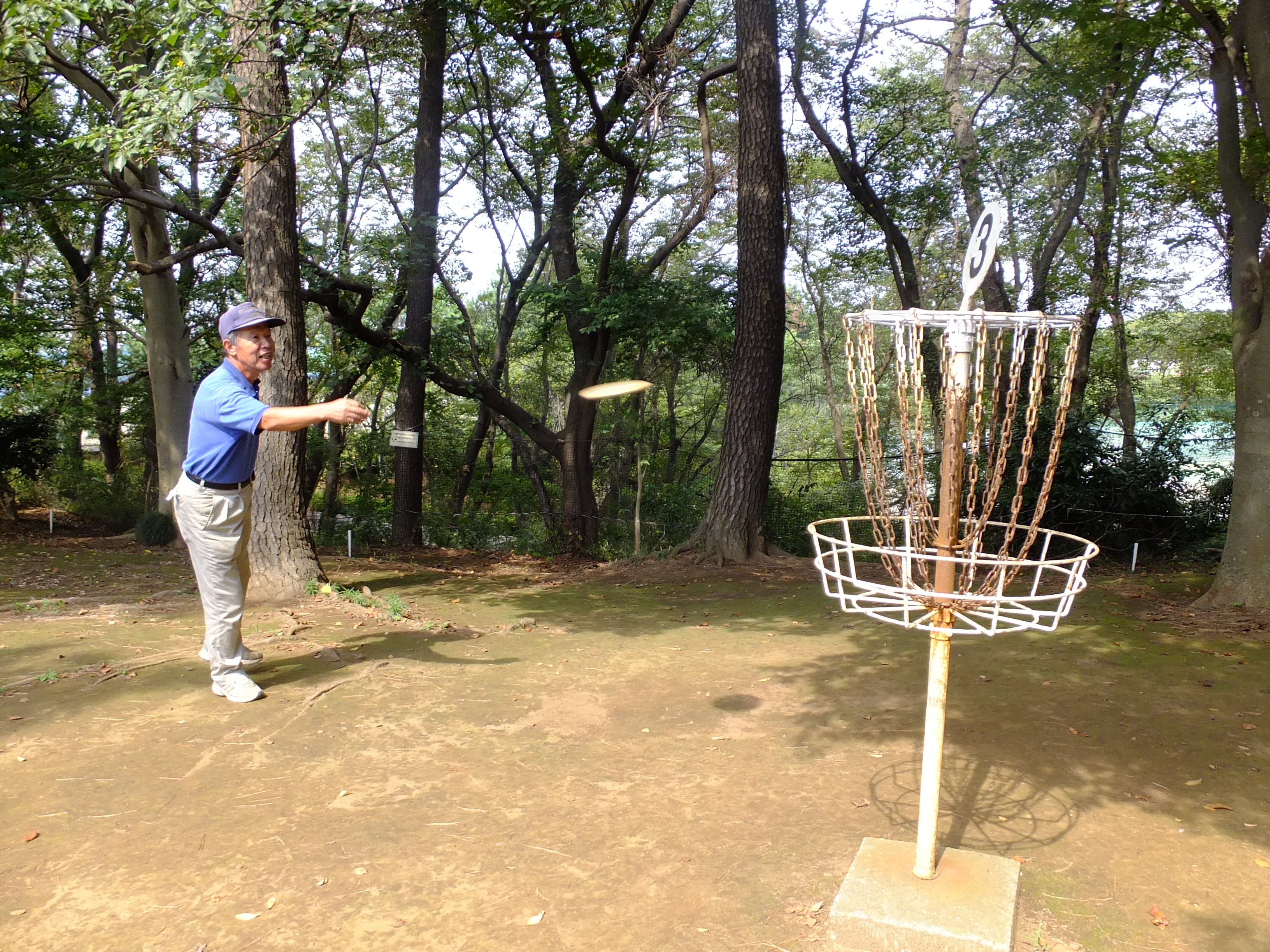 (円盤)を飛ばし、決められたゴール(バスケット)の中に何投で入れたかを競うところです。