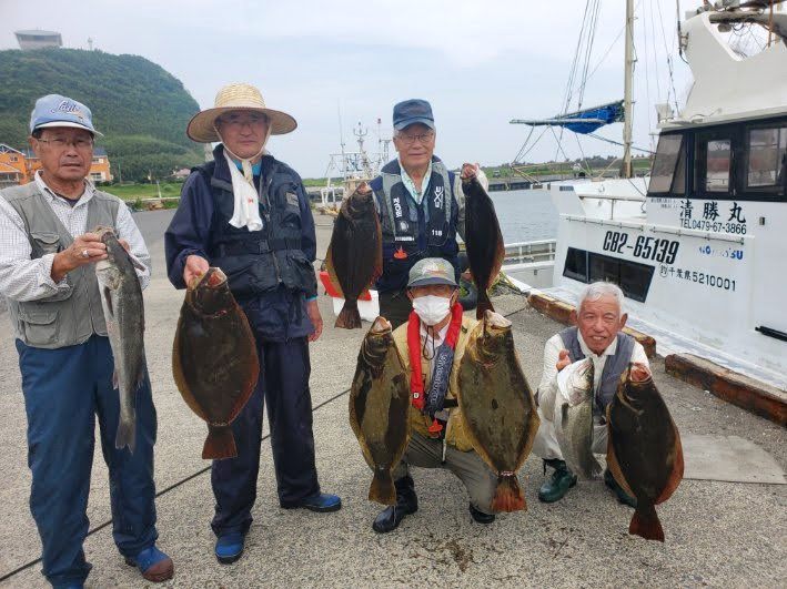 大漁の釣果ひらめを手に 後列左より:田原さん、野村さん、前田さん