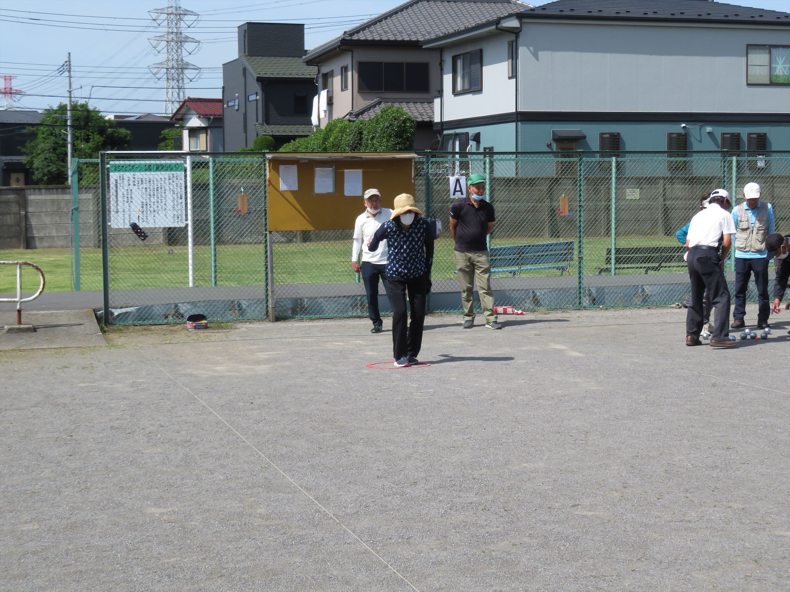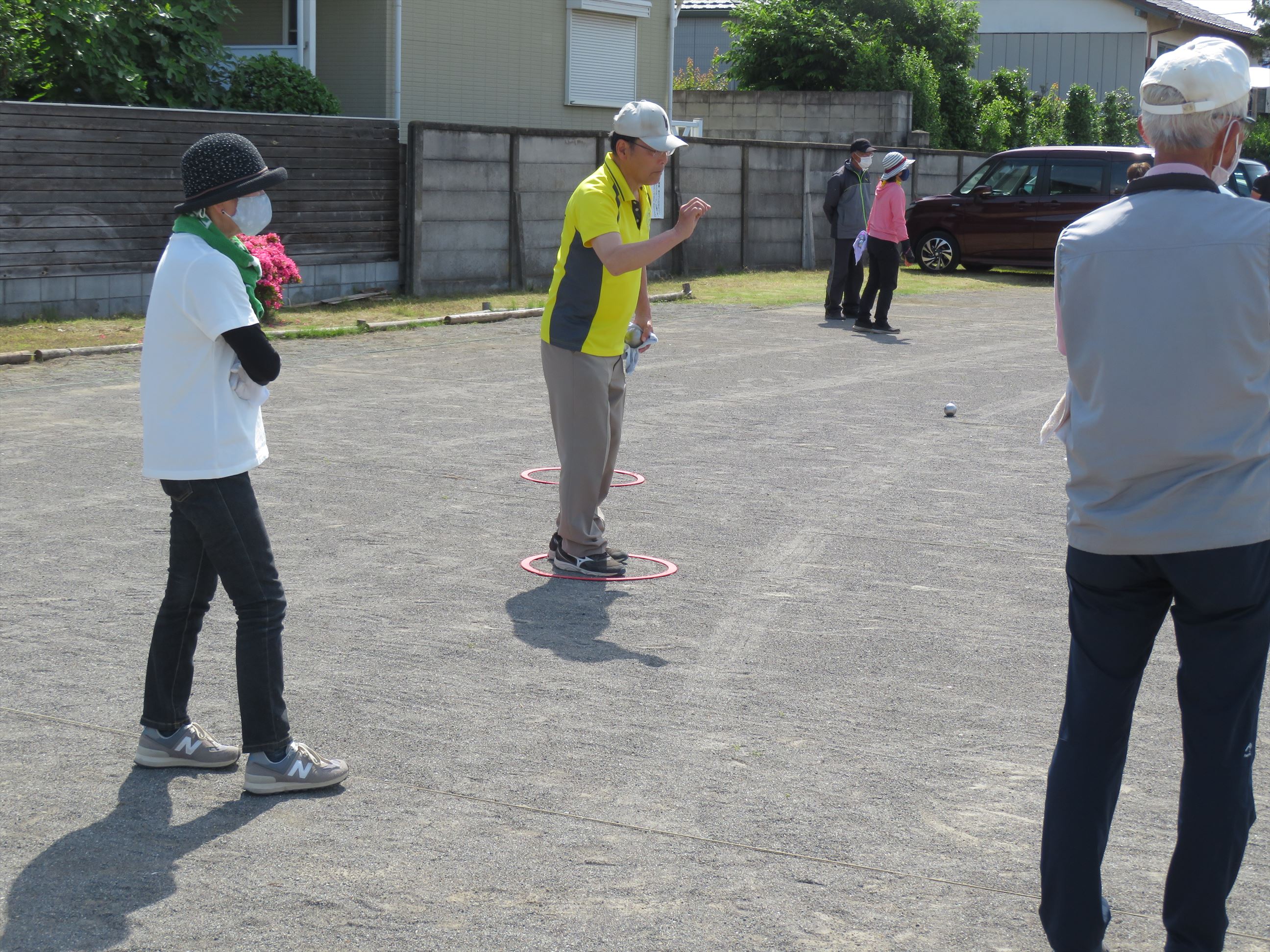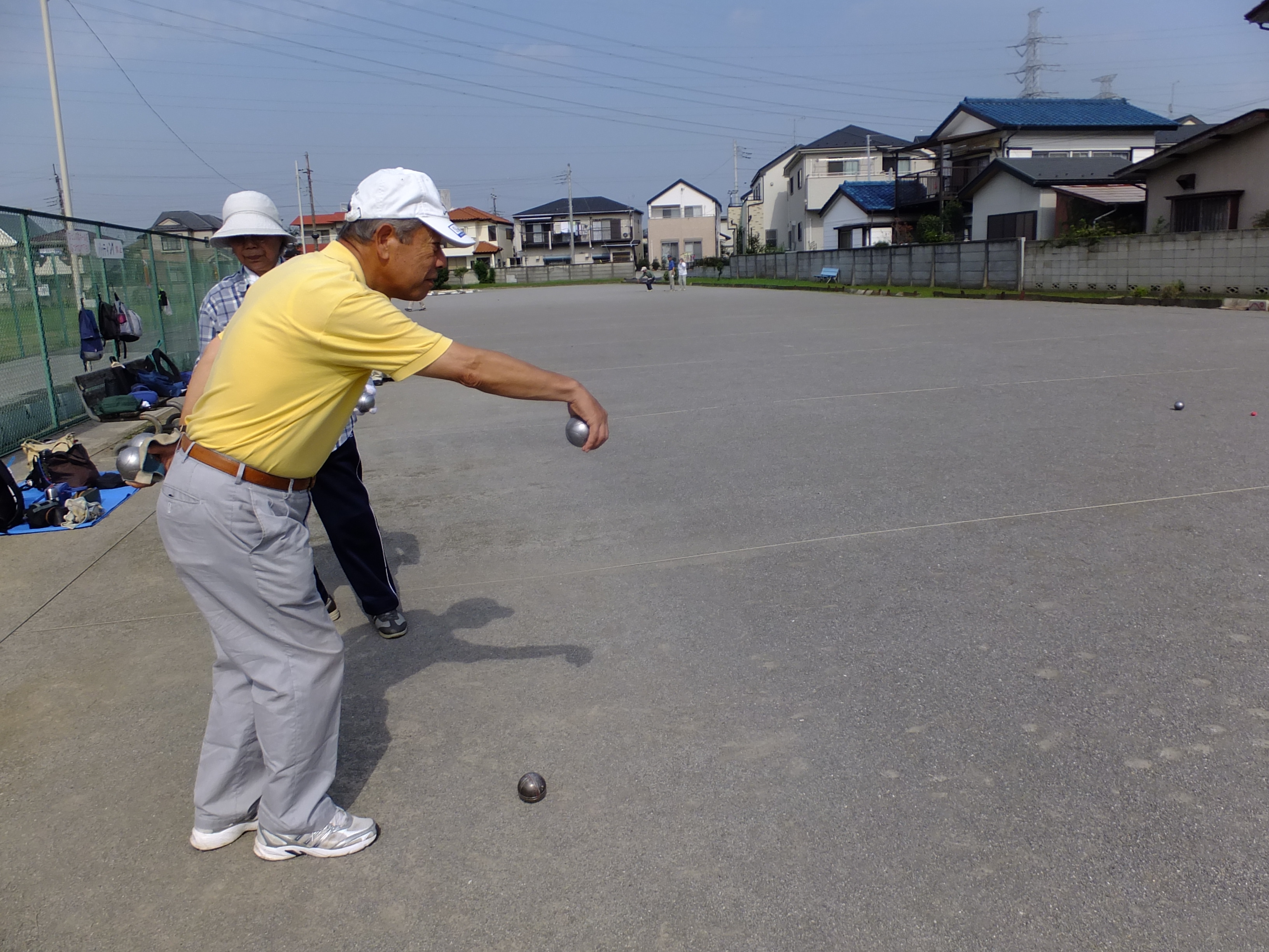 ルールは簡単です。2チームの内の先攻チームが、木製の目標球を前方6m から 10m の範囲に投げ、その目標球に向かって、金属製のボールを投げ合うものです。 目標球から遠いチームがボールを続投して、各チーム